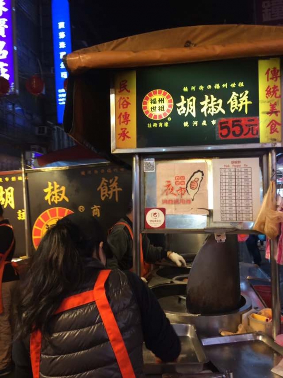 胡椒餅の有名店で、福州世祖のお店は饒河街夜市以外にもありました。饒河街夜市のお店の中でも有名で、夜市が始まる所でもあり、終る所にあるので、お客さんも並んでいました。牛肉から出る肉汁が熱くて、やけどに注意が必要です。