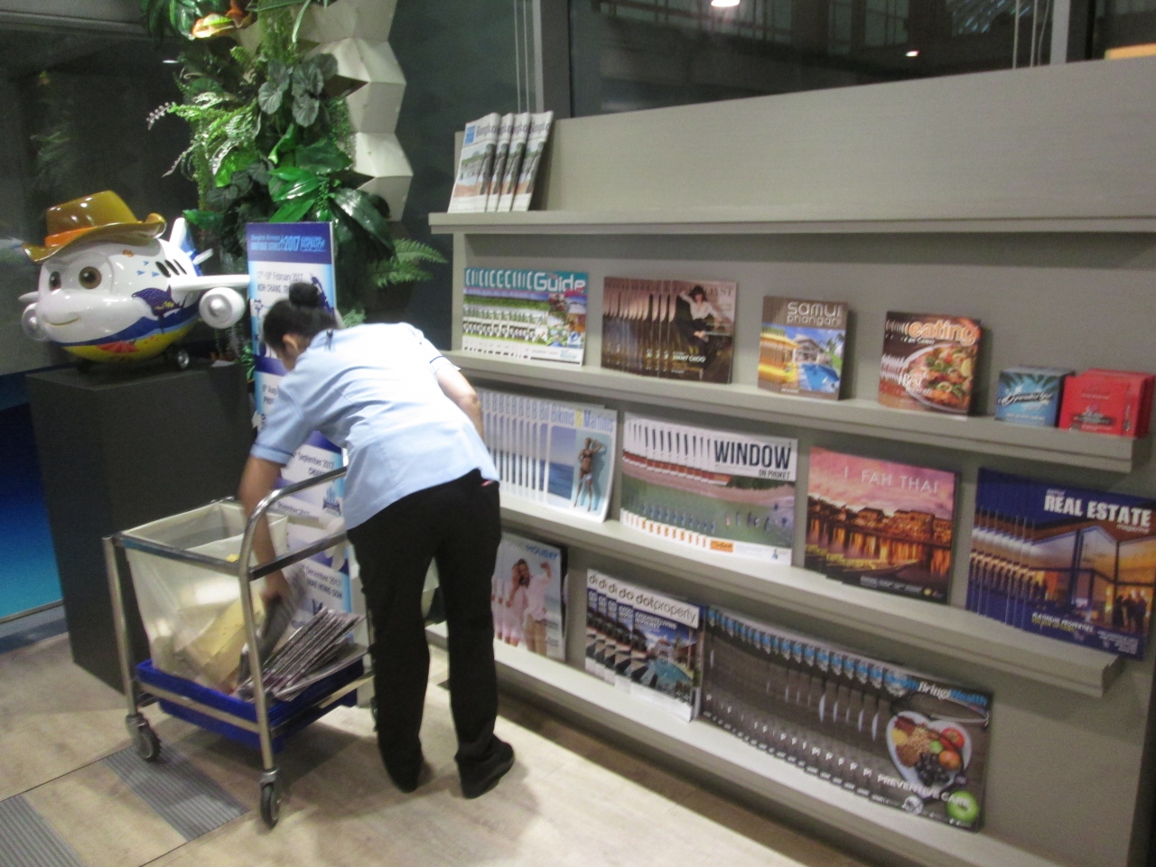 スワンナプーム空港のバンコクエアウェイズラウンジ新聞・雑誌類が置いてありました。最近、日系のエコノミー席では新聞・雑誌のサービスはありませんが、ラウンジでは読めました。スタッフが利用客よりも多い部数を棚にきれいに並べていたのが印象的でした。
