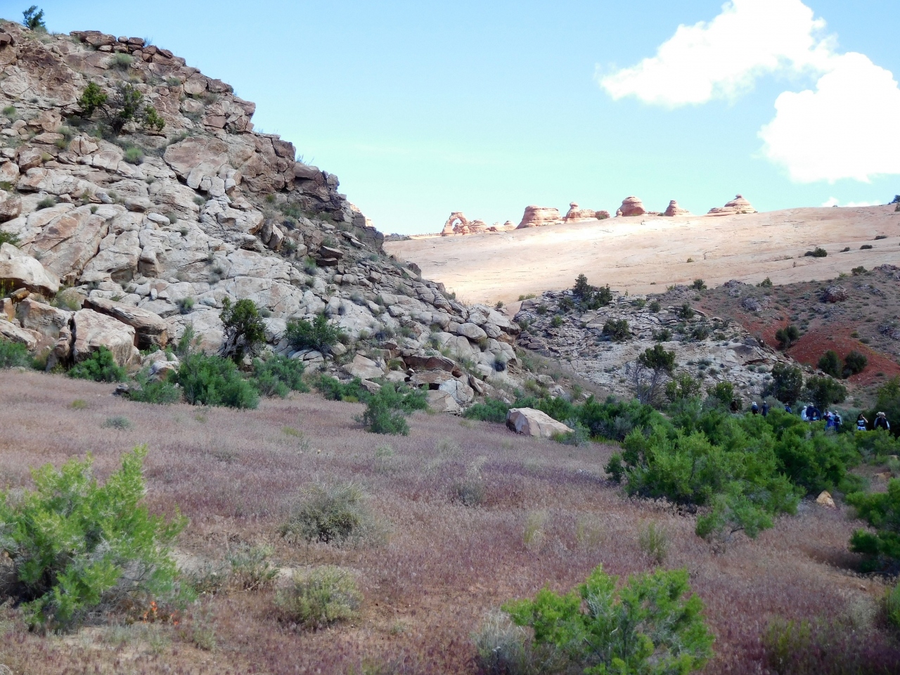 さらに進むと手前の山で隠れてしまいましたが、坂道を登っていくとデリケートアーチとその周辺の岩が見えてきました。