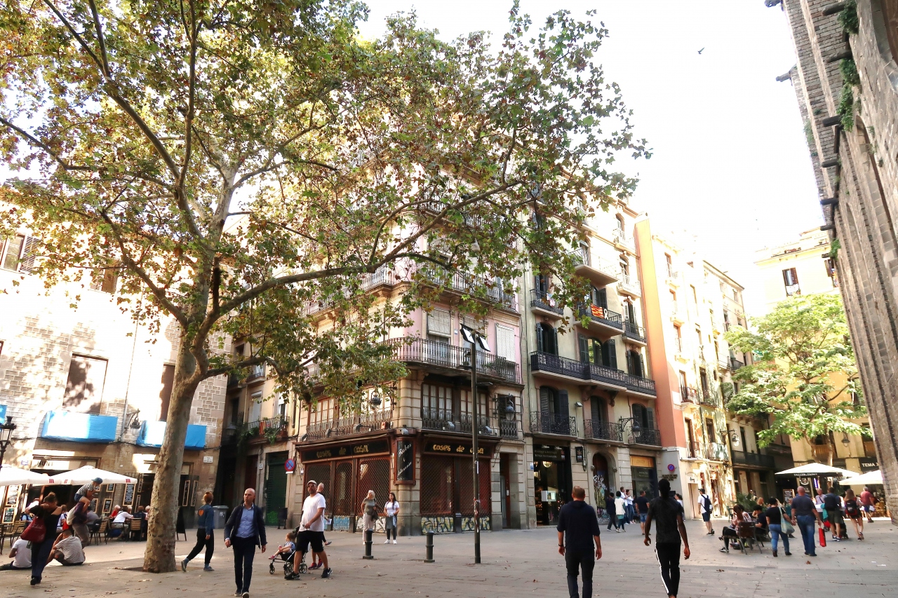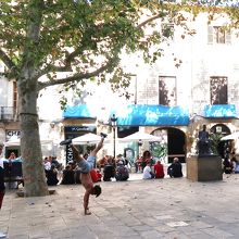 サンタ・マリア・デル・ピ教会に埋葬されている聖人ジョゼフ・オリオールの名が付いた広場は、サンタ・マリア・デル・ピ教会のファサードに面している松の「ピ」広場に続くお隣の広場で、教会の側面に面しています。小さな広場には劇作家アンジャル・ギマラーの銅像があるくらいですが、なぜか銅像のまわりを包囲するかのように老若男女が並んで座り、おしゃべりに興じていました。その後ろで誰が見ているわけでもないのに、逆立ちの練習をしている人までいました。広場からどこへ向かうのかよくわからない趣のある細い通りが伸びていて、迷路のようなゴシック地区の雰囲気が楽しめます。