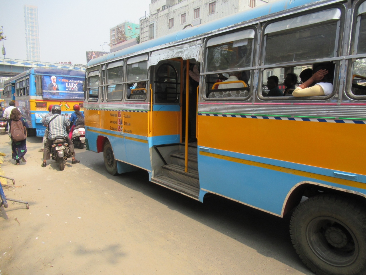 コルカタの町中はバスが便利でした。路線はGoogleマップで調べられます。クーラーの効いたバスは高かったですが、おんぼろのバスは7ルピーほどだったと思います。乗車すると車掌さんが近づいてきて運賃回収されます。