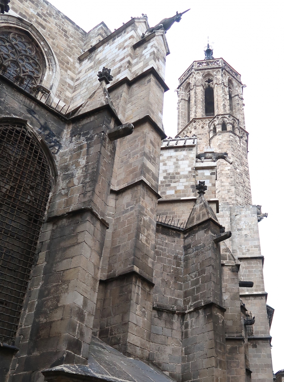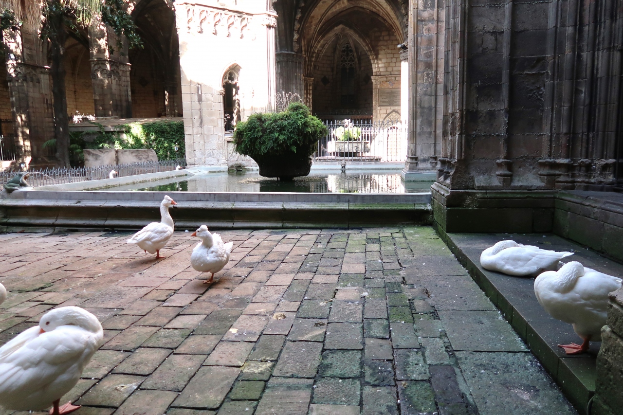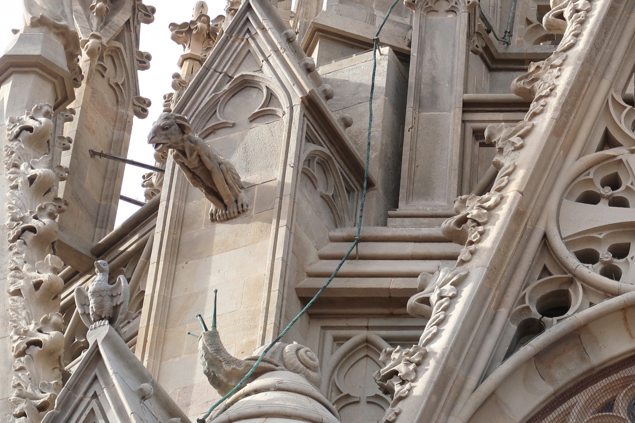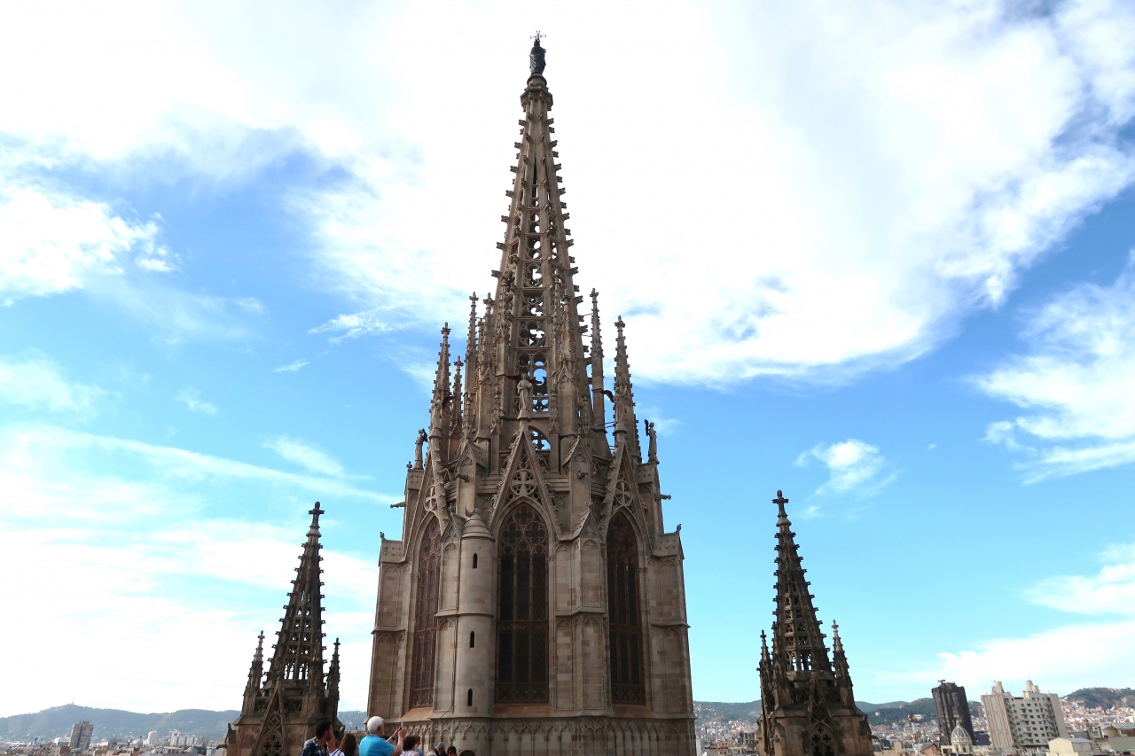サンタ・エウラリア大聖堂という名ですが、ドームの尖塔の上で十字架を掲げている聖女は聖エウラリアではなく、初めてキリスト教を信仰したローマ皇帝コンスタンティヌス1世の母親の聖ヘレナだそうです。13歳で殉教した聖エウラリア関連のものは、入口を入ると目の前にある聖歌隊席の拷問場面のレリーフ彫刻と、主祭壇の地下にある聖エウラリアを祀った霊廟、中庭で飼われている13羽の鵞鳥でしょう。カテドラルに入ってすぐの右手の礼拝堂には、レパントの海戦で飛んできた大砲を腰を右に曲げてよけたという奇跡のキリスト像があり、観光客も敬虔な祈りを捧げていました。屋根の上の展望台からは、360℃のバルセロナのパノラマが楽しめます。ガーゴイルの表情も間近で見ることができました。