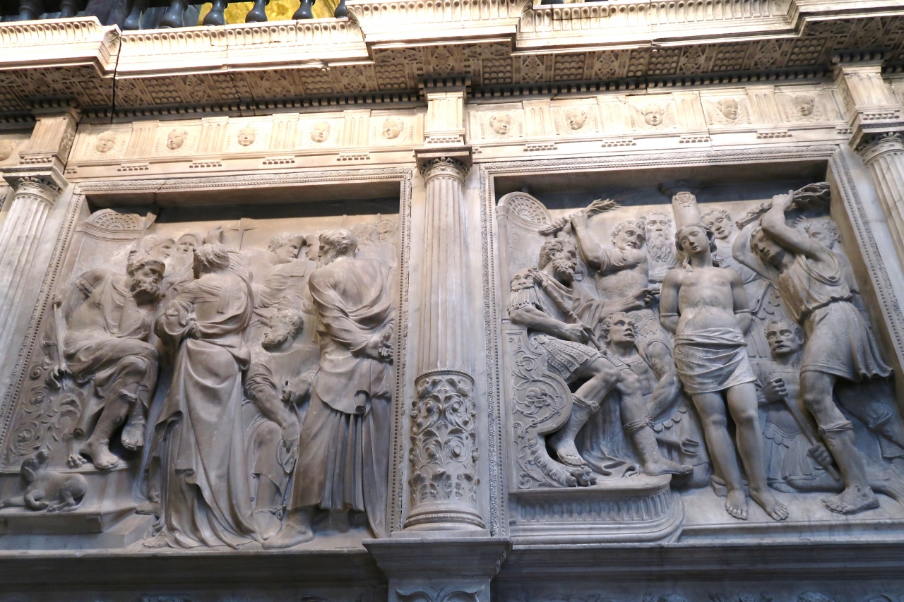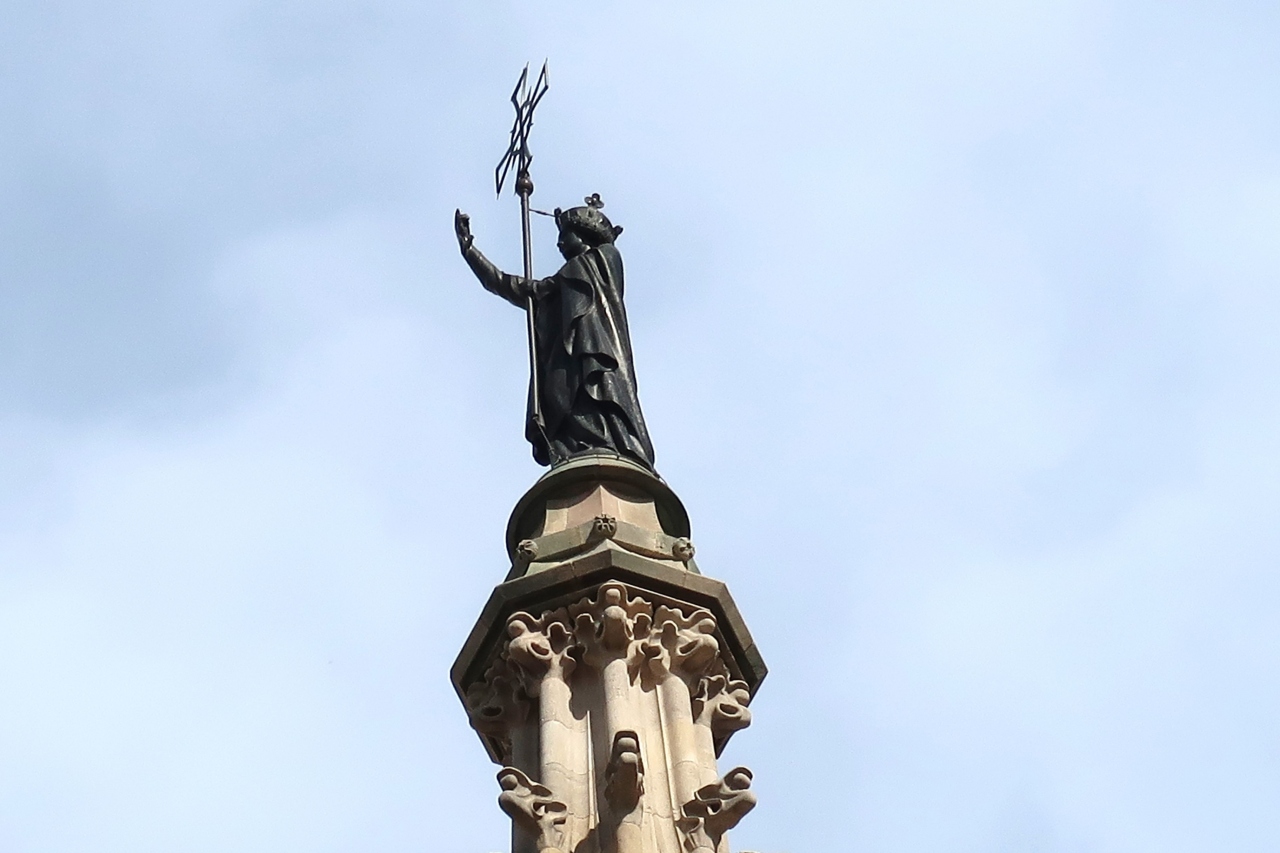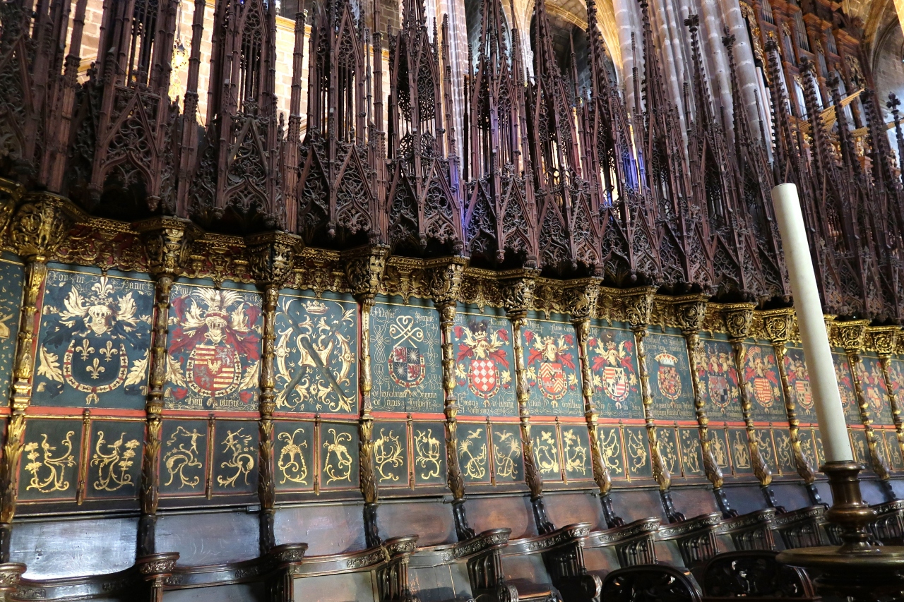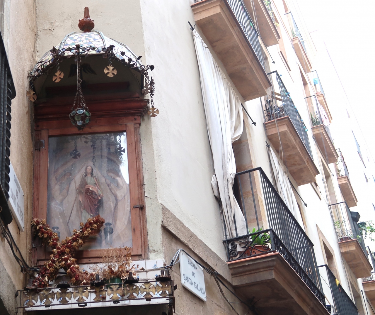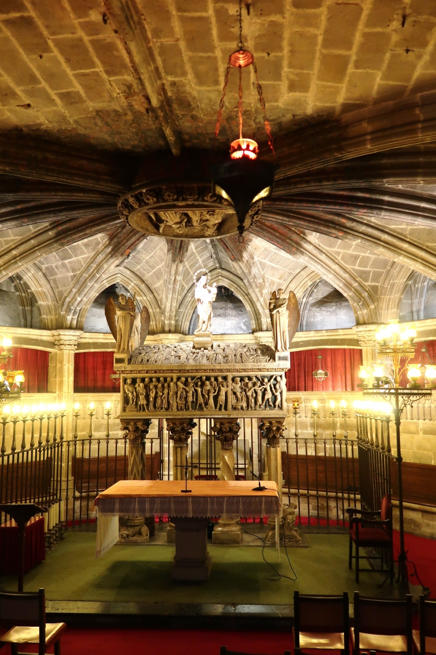 サンタ・エウラリア大聖堂という名ですが、ドームの尖塔の上で十字架を掲げている聖女は聖エウラリアではなく、初めてキリスト教を信仰したローマ皇帝コンスタンティヌス1世の母親の聖ヘレナだそうです。13歳で殉教した聖エウラリア関連のものは、入口を入ると目の前にある聖歌隊席の拷問場面のレリーフ彫刻と、主祭壇の地下にある聖エウラリアを祀った霊廟、中庭で飼われている13羽の鵞鳥でしょう。カテドラルに入ってすぐの右手の礼拝堂には、レパントの海戦で飛んできた大砲を腰を右に曲げてよけたという奇跡のキリスト像があり、観光客も敬虔な祈りを捧げていました。屋根の上の展望台からは、360℃のバルセロナのパノラマが楽しめます。ガーゴイルの表情も間近で見ることができました。