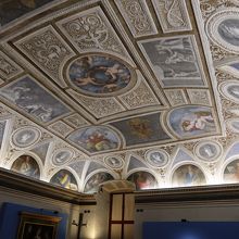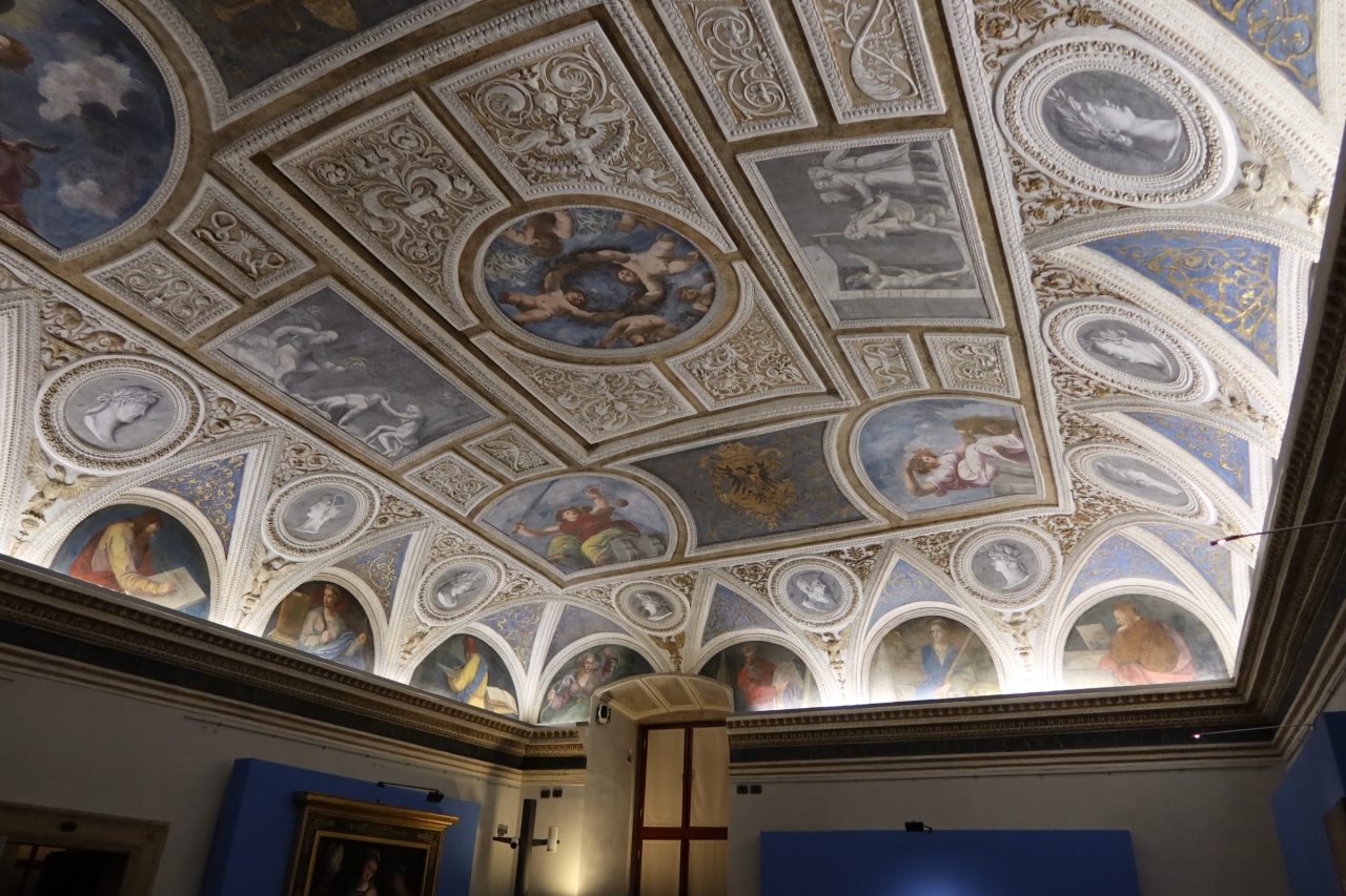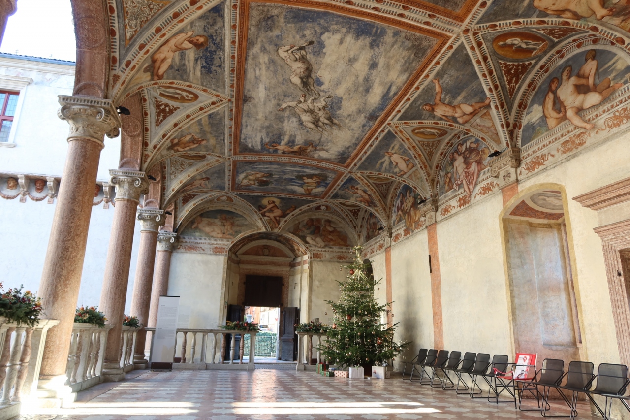 中にはいると各部屋を順番に見ていくパターンですが、ドッソとバティスタのドッシ兄弟によるフレスコ画や格子状天井装飾がある黒カミン部屋、中庭にアーチ支柱の部屋にあるロマニーノのフレスコ画がとても綺麗でした。