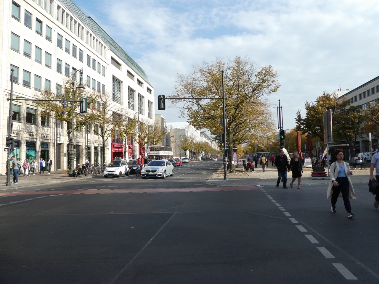 かの有名なベルリンの一番の繁華街。一番の目抜き通り。なんと名古屋の100m道路みたいにだだっ広い通りで真ん中は並木道の散歩道。環境も素晴らしいです。両側の建物もそう高くないので広々と感じるのでしょう。なにせ、ビル越しに彼方のベルリンのテレビ塔が見えるくらい。なお、賑やかさはさほどでもないです。端っこがブランデンブルグ門です。