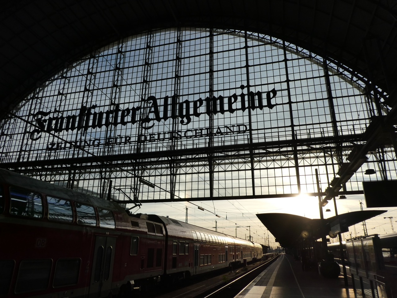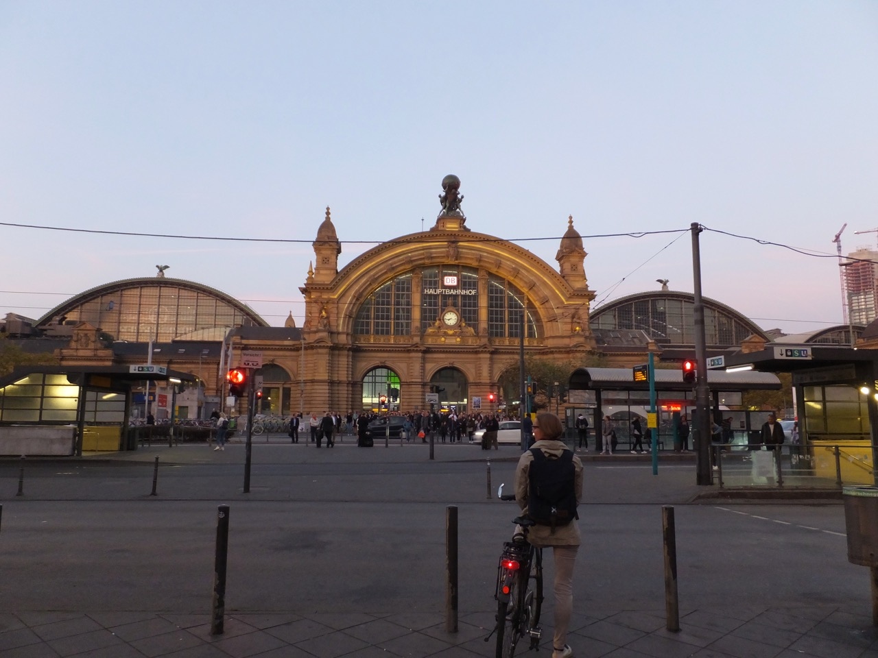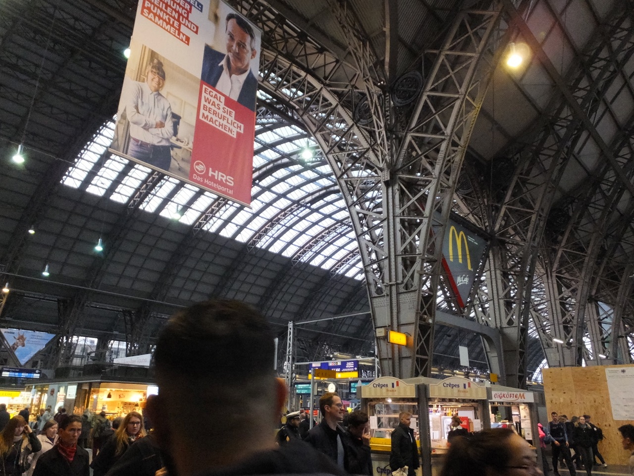 ターミナル駅は行き止まりの駅が多いのがヨーロッパ。このフランクフルトも駅舎から向こうに巨大なガラス天井で覆われたホームがずらりと並ぶ駅です。駅舎のドームも高く大きく拠点駅の雰囲気があります。ゆきかう人の数も多く賑やかです。