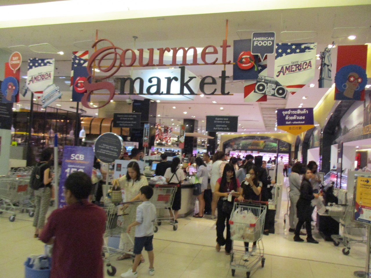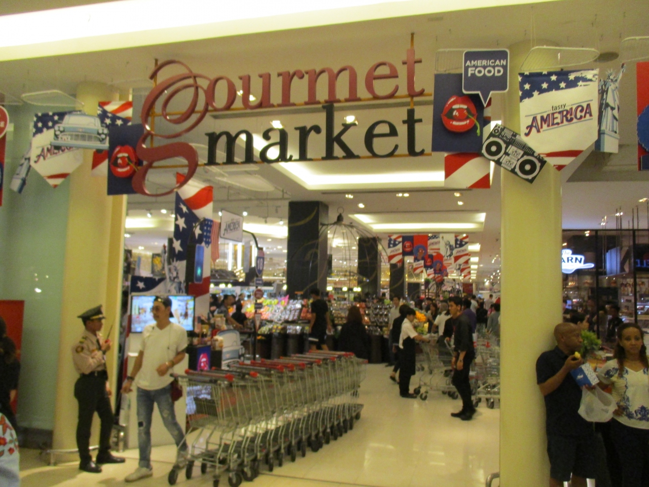 グルメマーケットでアメリカンフェアを開催していました。こちらは、輸入品商品の品揃えに力を入れているのか、品質の良い野菜、果物を扱ったり、調味料を見かけました。臨時の調理場を設置し、輸入した素材で作ったメニューを提供していました。