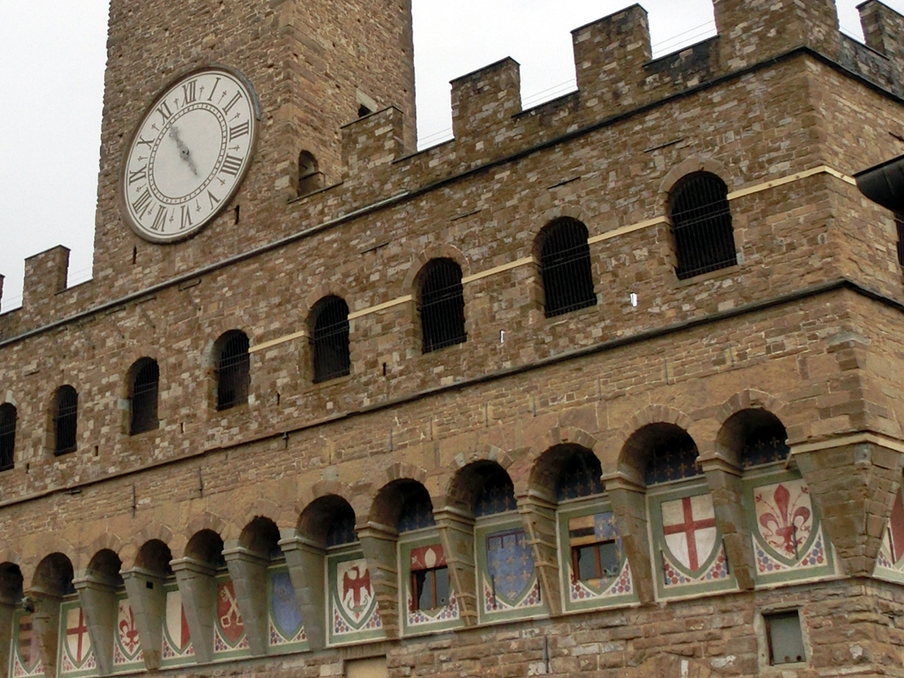 ヴェッキオ宮殿の外壁にはかつてトスカーナ大公国の共和国に加盟していた都市の紋章が、ずらりと並んでいます。