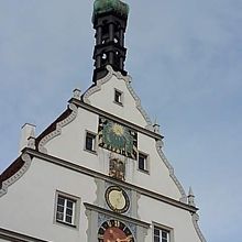 旧市街地の中心にあるマルクト広場の北側にあります。白のスッキリとした建物で 3階にある仕掛け時計が有名です。時計の左右にある窓が決まった時間に開き、人形が現れ手に持ったワインを飲み干します。これは17世紀の三十年戦争の時にローテンブルクの元市長がワインを飲みほし、街の破壊と処刑を回避したというの逸話を表しているそうです。 マルクト広場で一際目を引きます。