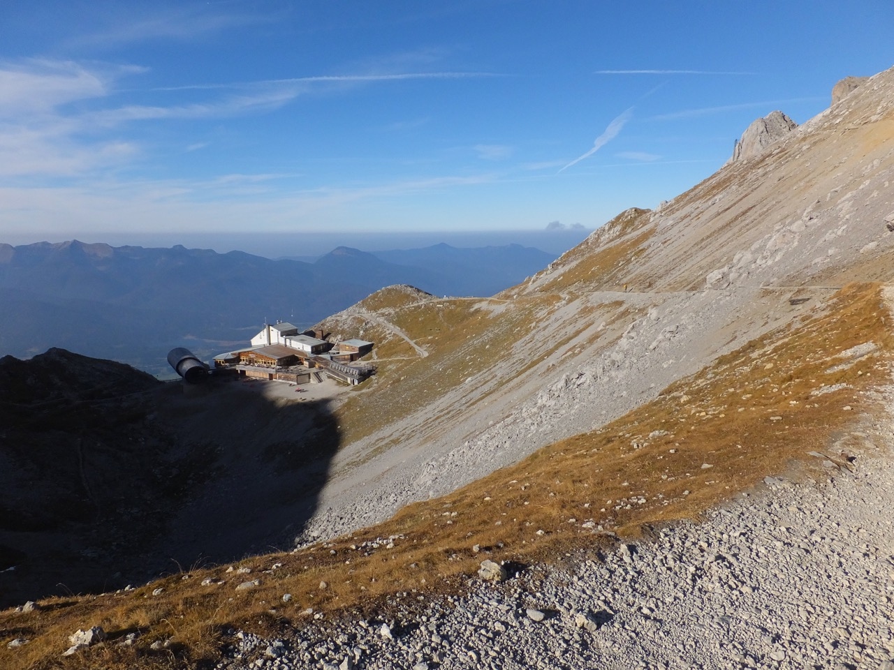 そして1周約1時間の山頂遊歩道を歩きましょう。尾根に出るとはるかスイスアルプスが地平線を埋め尽くしています。そして急勾配の下は山奥の小さな村と草原。あまりの絶景にめまいがしそう。そしてここがオーストリアとの国境。