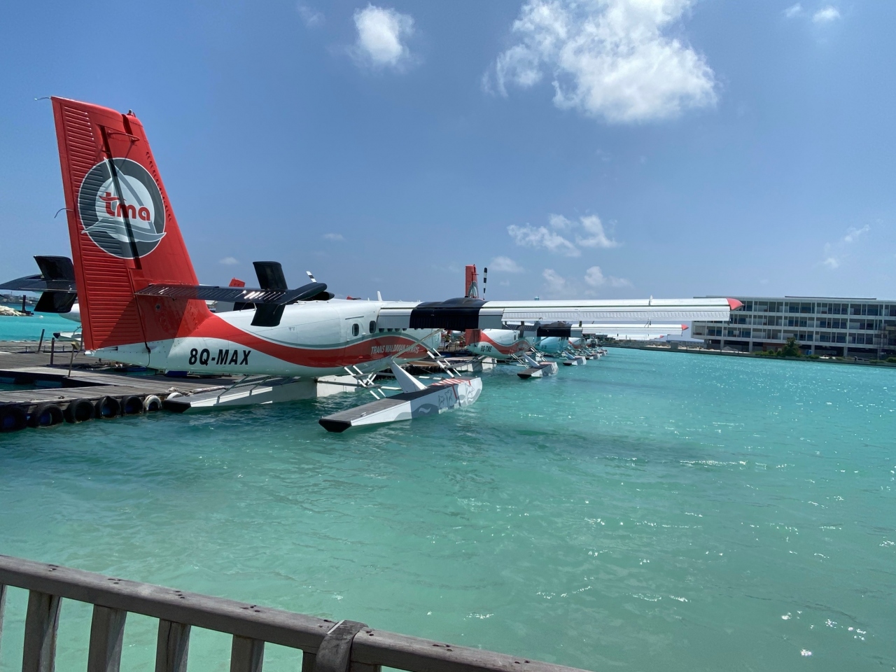 初めての水上飛行機に乗って、リゾートアイランドに出発です。中は思ったより広く、18人ぐらい乗れました。眼下には、青い海や薄いブルーのサンゴ礁の島が見えて、ワクワク感が高まりました。着陸するときにちょっと緊張しました。