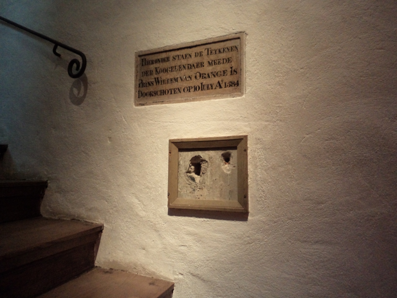 1階から2階に上あがる階段にウィレム1世が暗殺された銃弾跡が残っています(囲われているので見つけやすい)。2.3階はデルフト焼きの作品やデルフトの歴史の説明スペースとなってます。