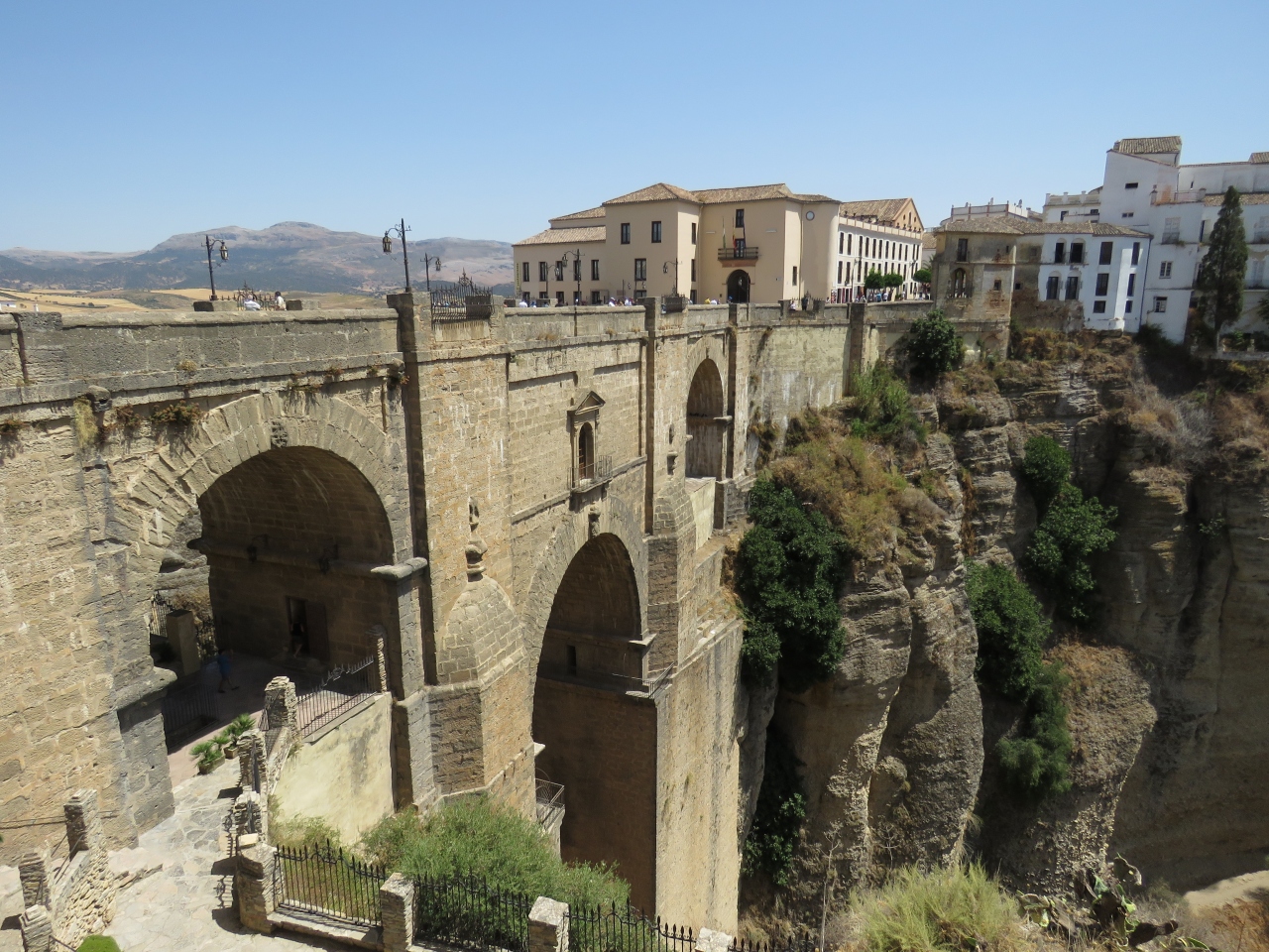 ロンダの新市街地と旧市街地の間にはタホ渓谷という約100メートルの深い谷があり、谷の上にこの橋が架かっています。谷の断崖絶壁、崖のぎりぎりまで建物がある新市街地と旧市街地、このヌエボ橋のコントラストが絶景です。ロンダで一番の観光スポットなので、ロンダに行ったら必ず行くべきです。ヌエボ橋のたもとの北から下に降りたところに有料の情報センターがあり、橋の内部に入れます。