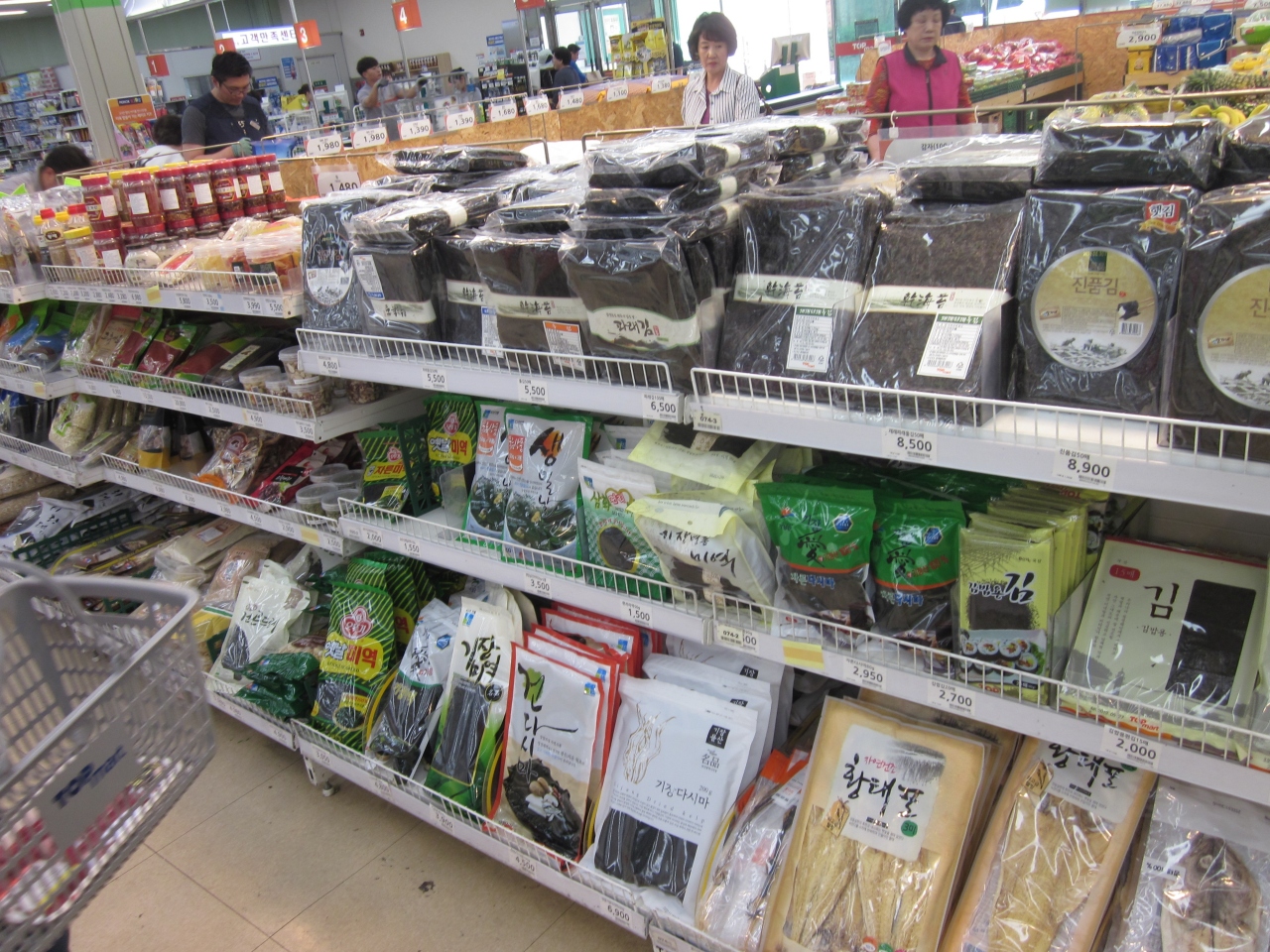 近くまで来ていたので、お土産用の海苔を買いに来ました。お土産店、デパートで買うと値段が高いので、ローカルスーパーで買うとお買い得ですね。小さな小分けのパックの海苔が1500W程で売っていました。
