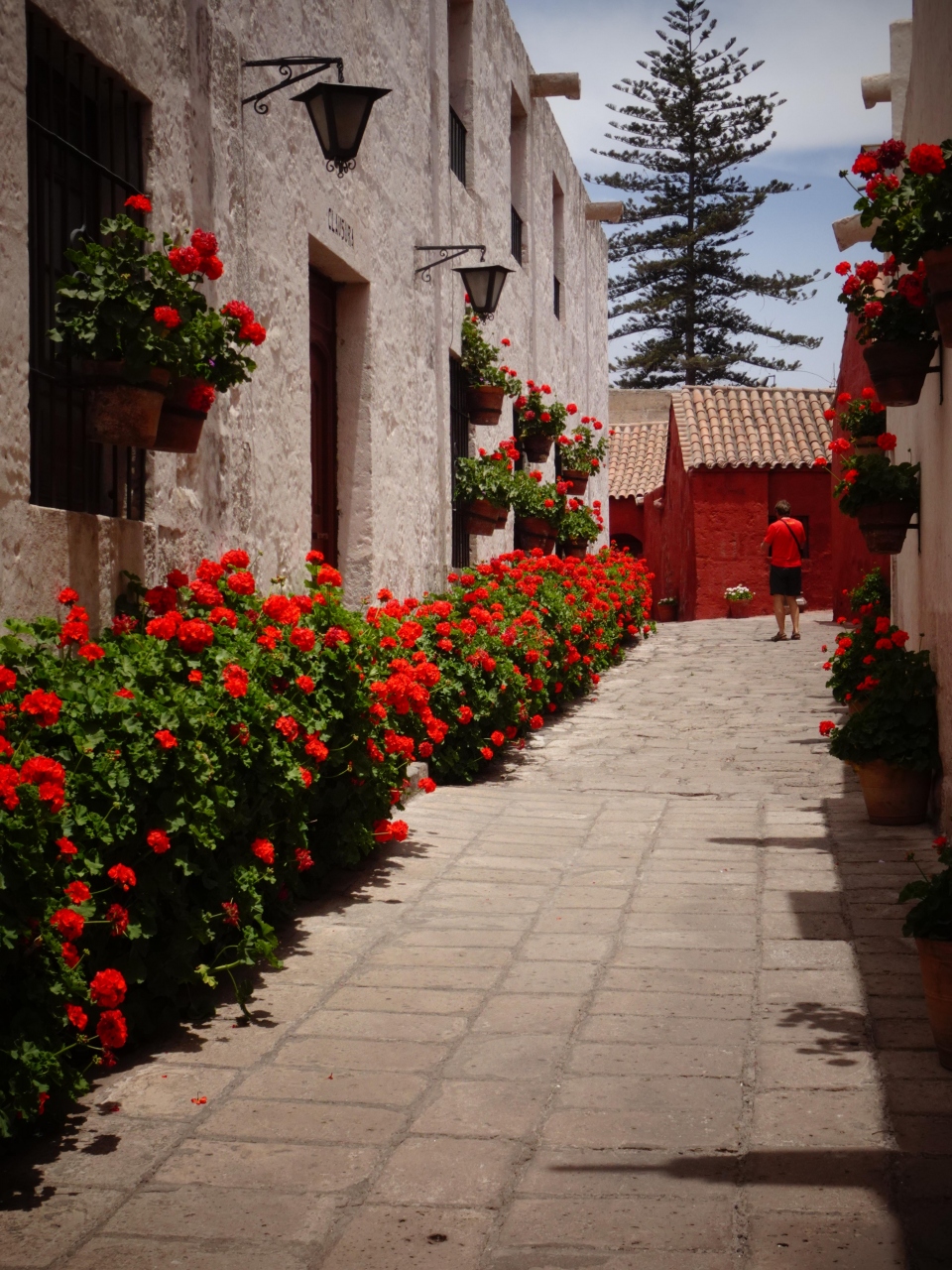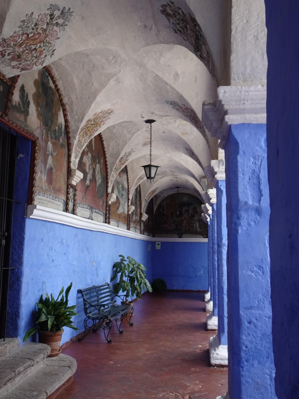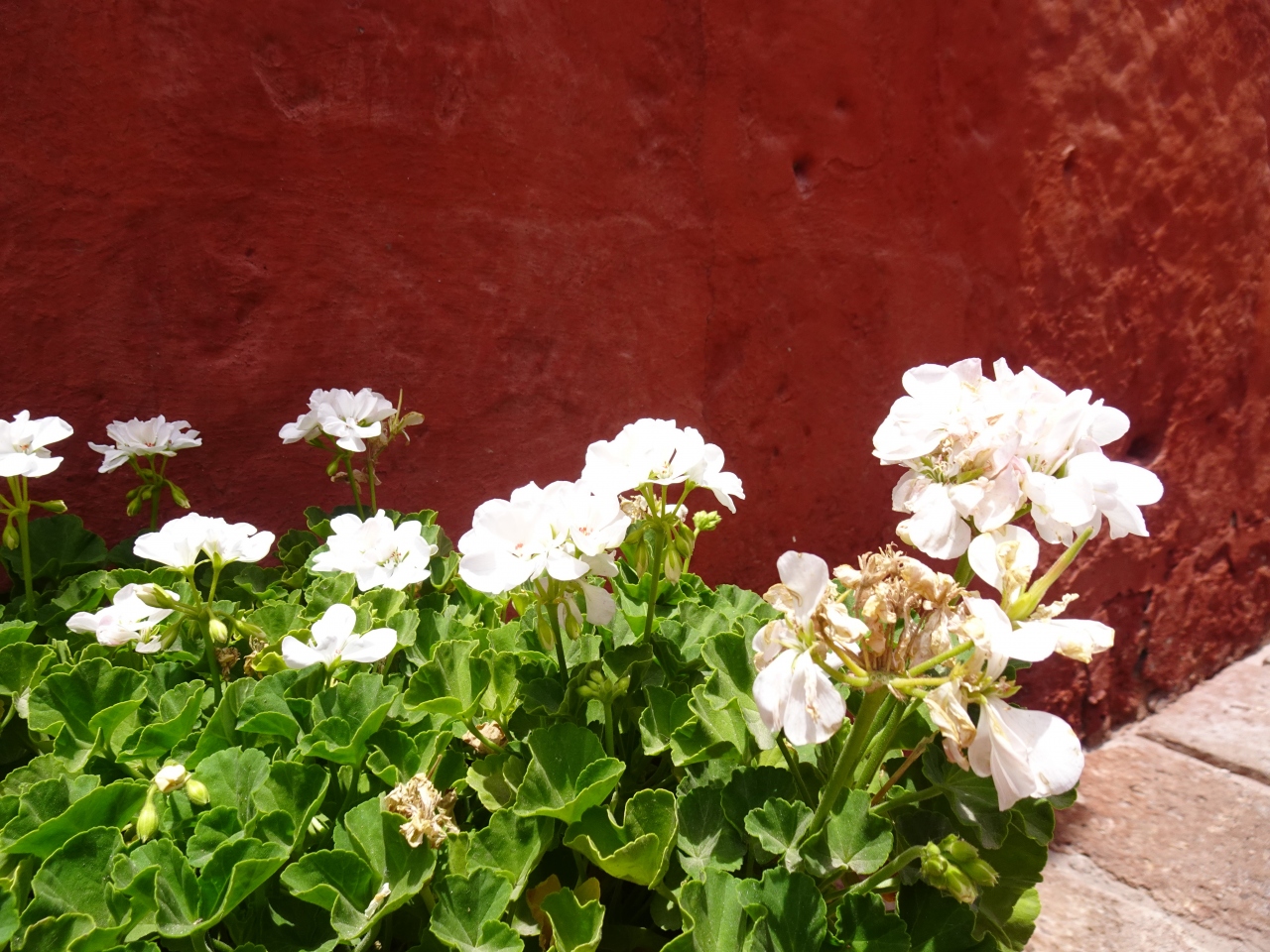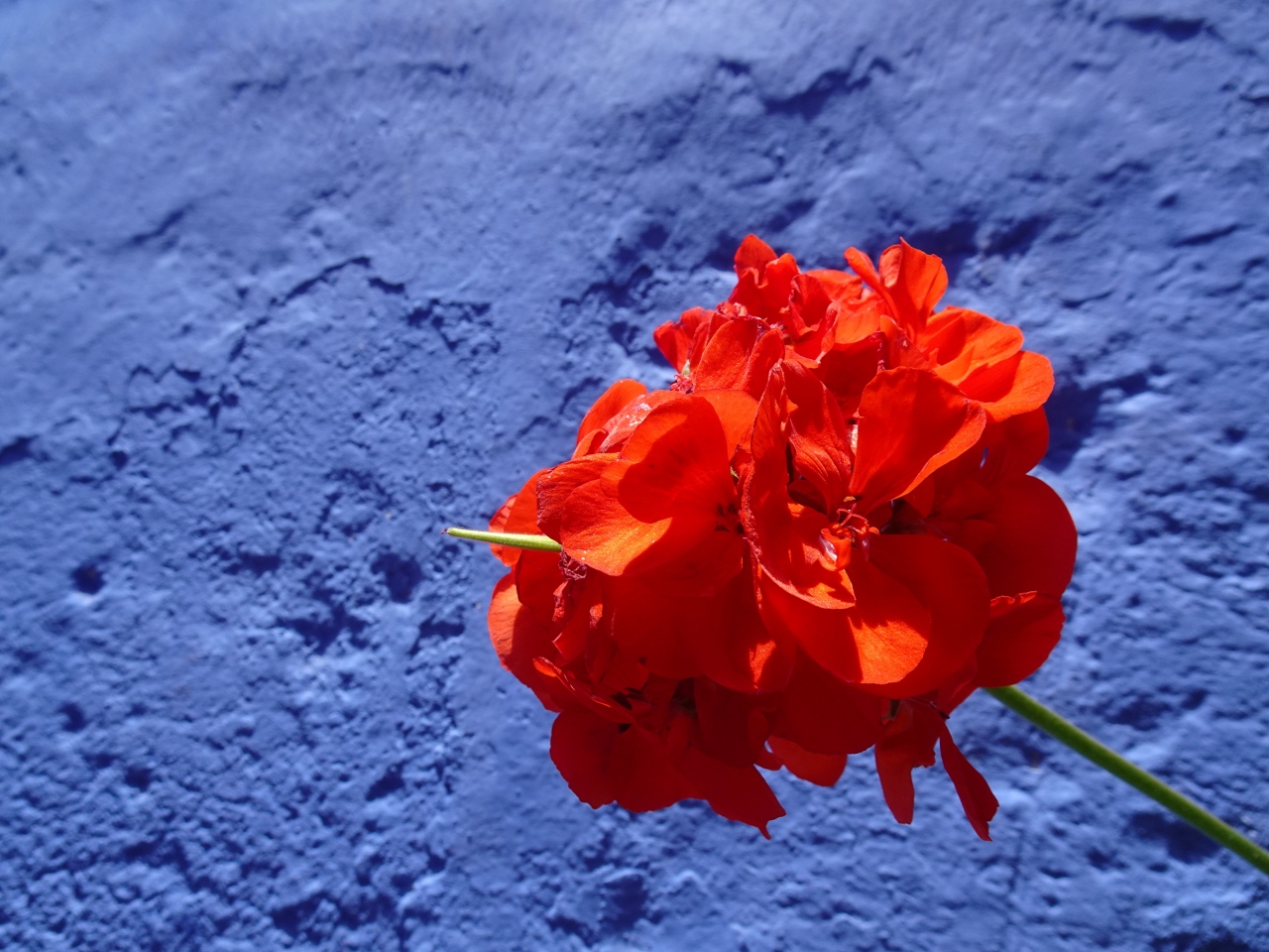 白・青・赤茶に塗られた壁と、壁の色とのコントラストを強調するように