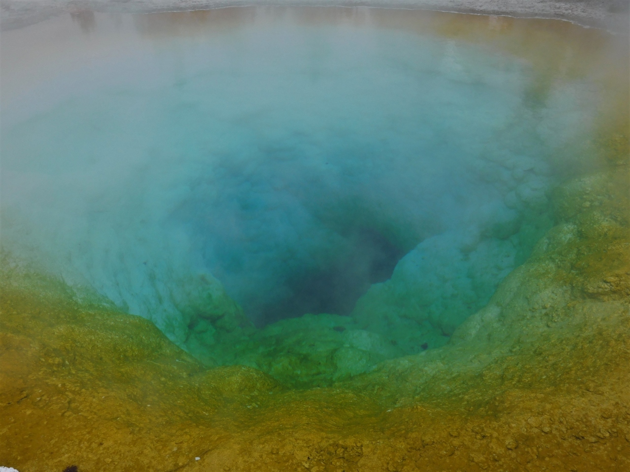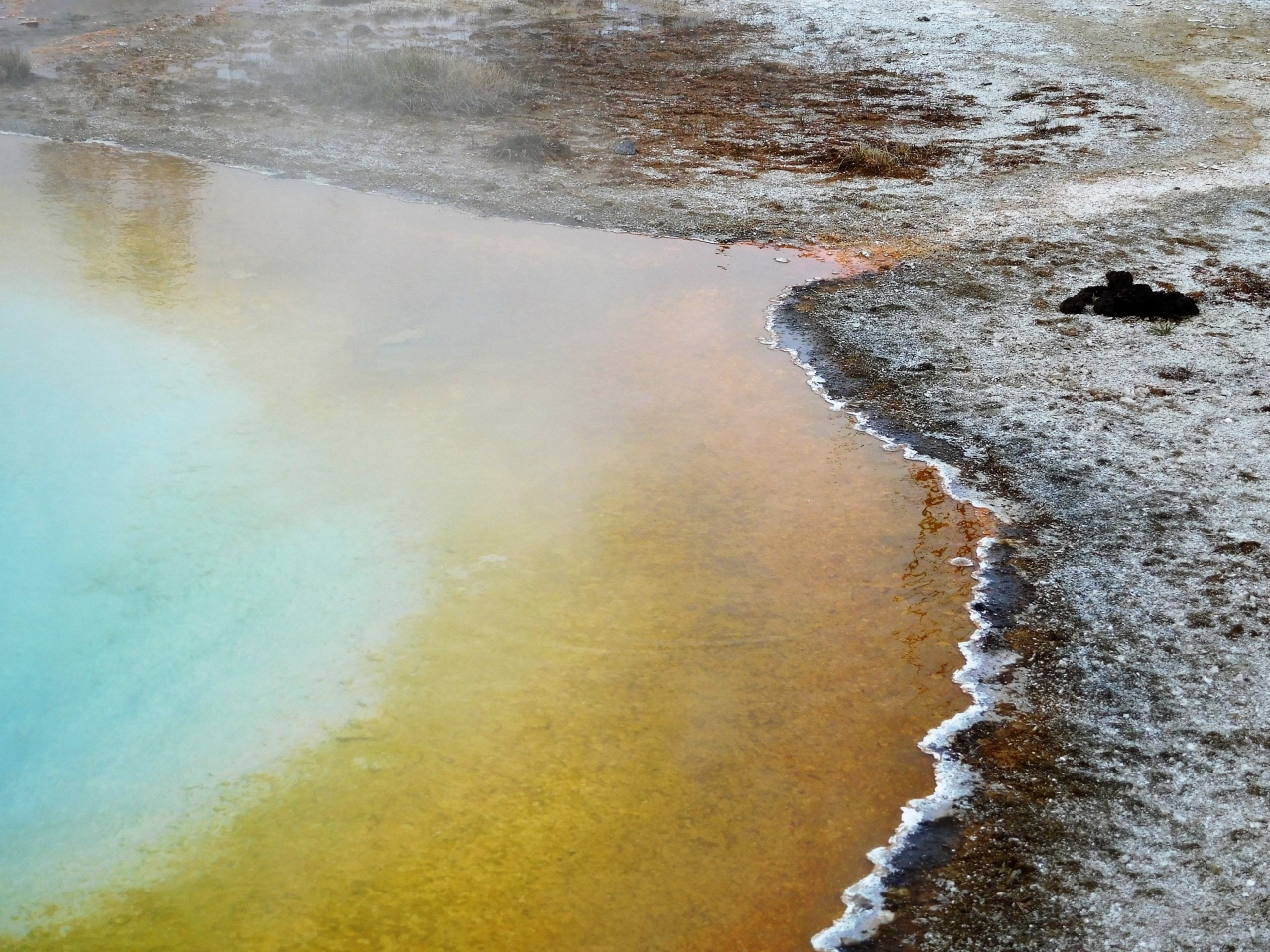 ビジターセンターから温泉を見ながら歩くと着きました。周りのオレンジと水色がかった色がきれいです。
