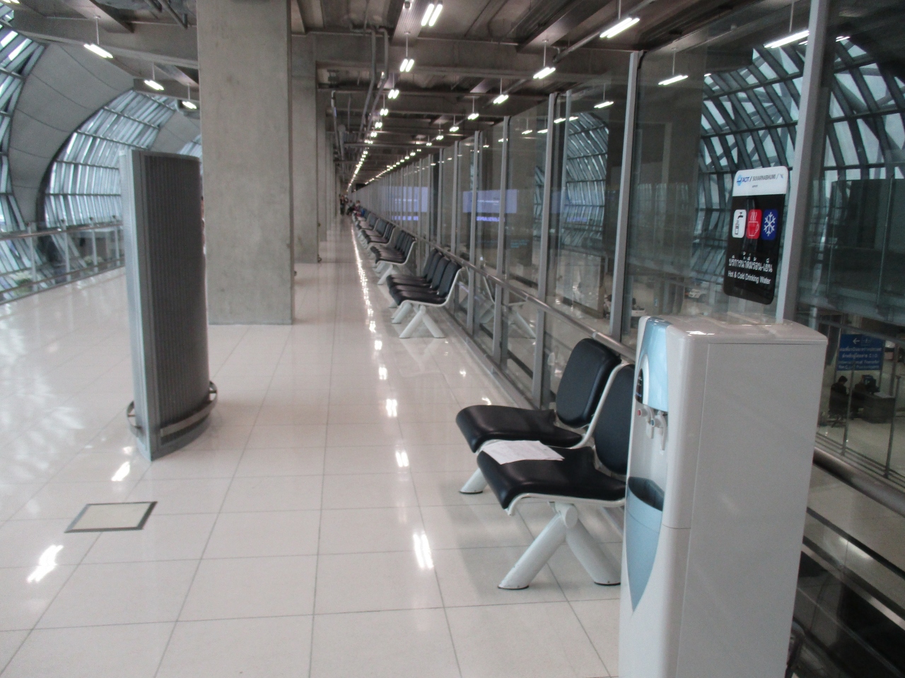 スワンナプーム国際空港の制限区域内に給水設備がありました。この空港はお手洗いの数が多く、待たされることはありませんでしたが、基本的にお手洗いを出たところや休憩用の椅子付近にその設備はありました。保安検査場で中身が空のペットボトルは没収されませんので、制限区域内でペットボトルにタイの水を入れました。
