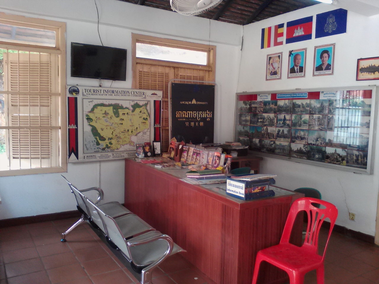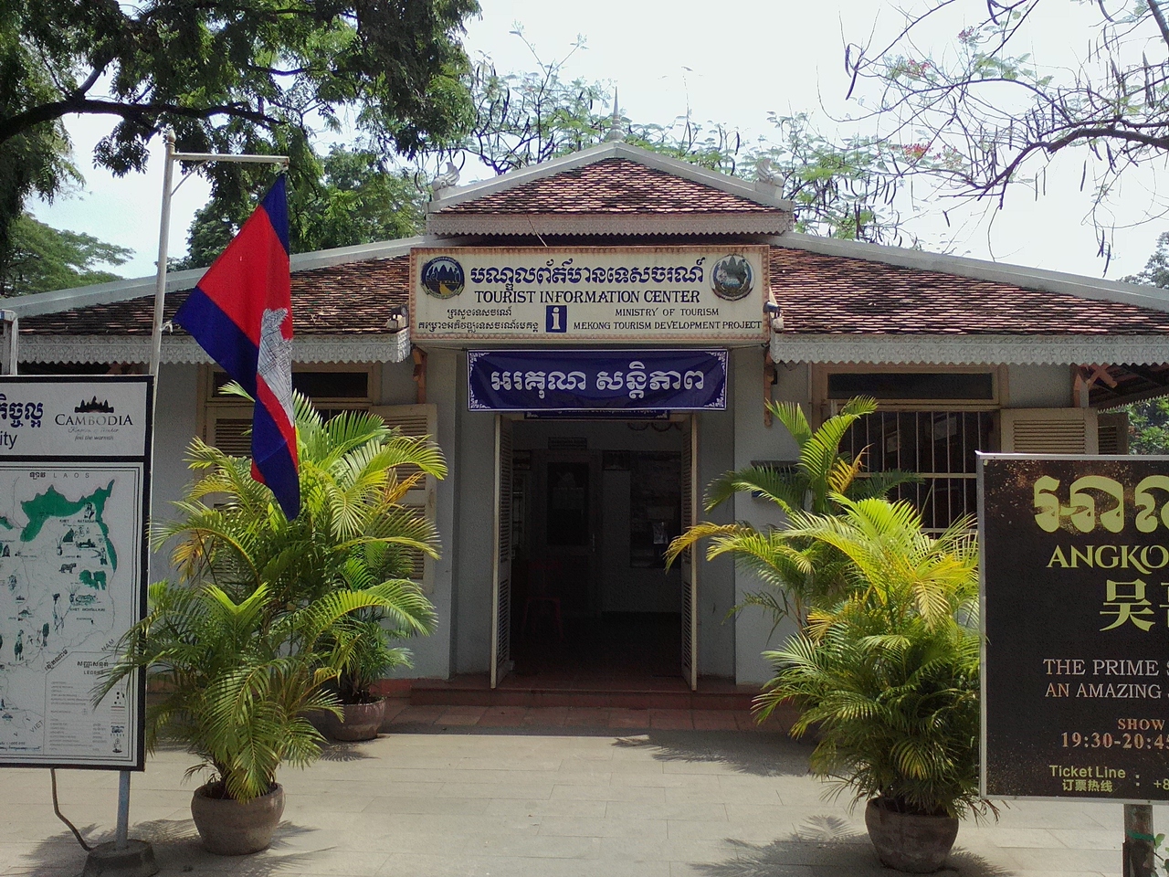 国道6号線沿いにあるロイヤル・インディペンデンス・ガーデンの一画にあります。新型コロナの影響で旅行者がほぼなくなったシェムリアップ。観光案内所も閉鎖してるのかなと思いつつ訪れてみるとなんとオープン。しかし中を覗くと誰もおらず…。いや、公園に散歩に来たであろうおじさんがくつろいでいました。スタッフは外に出ていていないとのこと。まあ、旅行者がいようがいまいがそんなことは気にせず仕事ができるお国柄ですから。私も特に用事はなかったので何も困りませんでした。