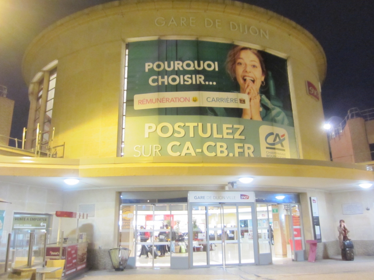 リヨンからFLiBUSを利用した時はディジョン駅前で降りました。パリに戻る時はTGVを利用しました。発車時間が近くになると電光掲示板にホームの番号が表示されるので、構内の表示に従って移動しました。待合室は広かったです。