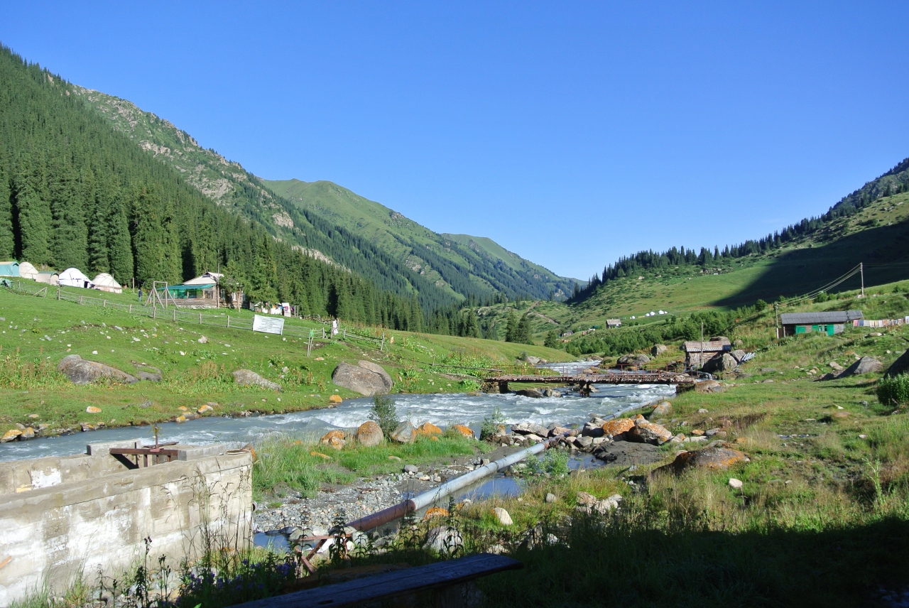 イシク・クル最西端、カラコルの郊外の山の中にある温泉です。カラコルのチョン・バザールから出ている350番のマルシュルートカで登山口のある村まで行けます。運転手さんに「アルティン・アラシャン」と言えば下ろしてくれます。