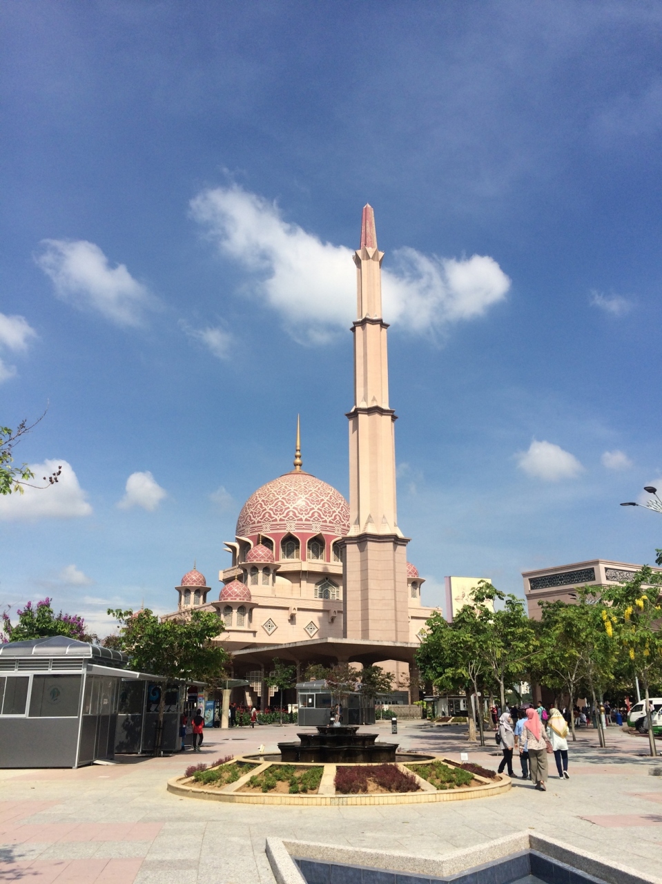 一生懸命自力でプトラジャヤ駅まで来て、そこから地元のバスに乗って到着しました。バスの窓からピンクが見えて来た時は感動しました。川沿いにあり、川側から撮った風景と、正面から撮った風景でプトラモスクの角度が違って良いです。
