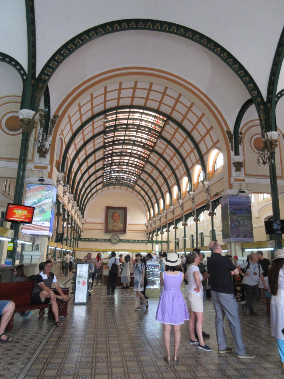 ドンコイエリアにはホーチミンで一番の観光スポットですが、その中で代表的な建物が中央郵便局です。フランス領時代に建てられ歴史ある建物なので、高い天井の大空間のある建物なので重厚感があります。記念に切手や絵葉書のお土産があります。