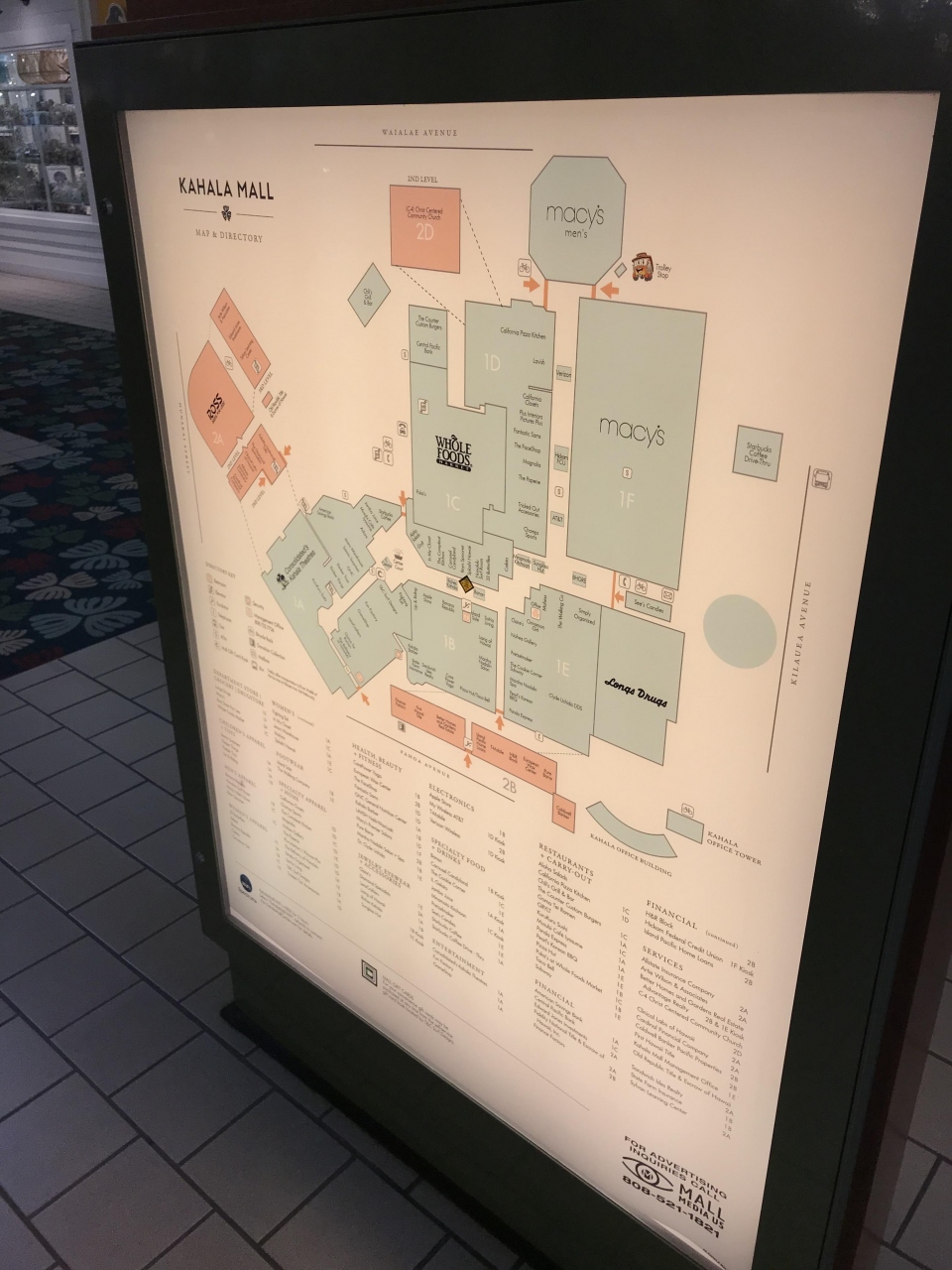 カハラモールは通路が絨毯敷きで、通路も広く、ゆったりとお買い物を楽しむのに最適です。駐車場も結構広いので、車で行っても然程駐車に手間取りません。ホールフーズ、ロスドレス、ロングス等々人気のお店も多く、いつもロコたちで賑わっています。