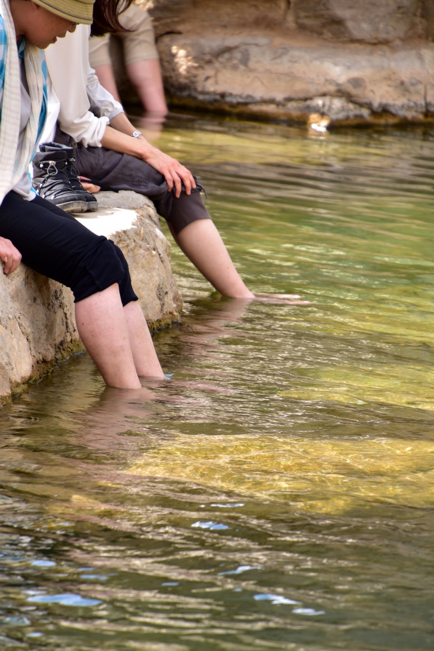 泉の縁の岩に座って水に足を浸すと、ドクターフィッシュがたくさん群がってきます。