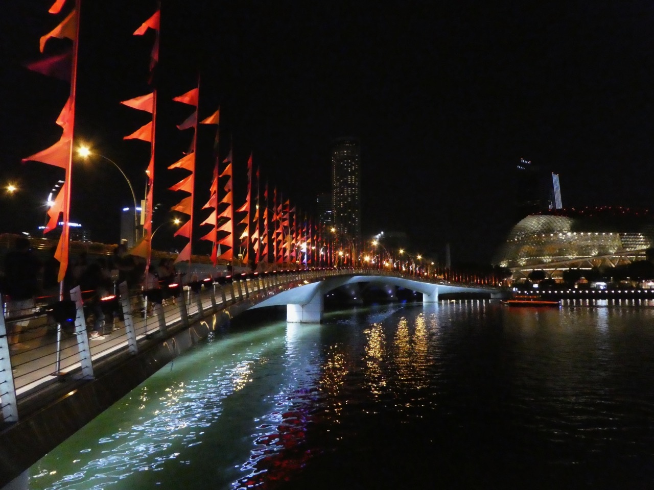 今回はマリーナ湾の夜景鑑賞時に利用。普段は路面を照らす照明だけなのだと思いますが、訪問時は三角の旗を連ねた竿に照明を当てて華やかな印象の空間を作りだしていました。最近、シンガポールは夜景に力を入れているようで、いろんなライトアップが楽しいです。夜のマーライオンやマリーナ湾への散歩に、ここを渡ってサンズ までマリーナ湾を半周するのがおすすめです。
