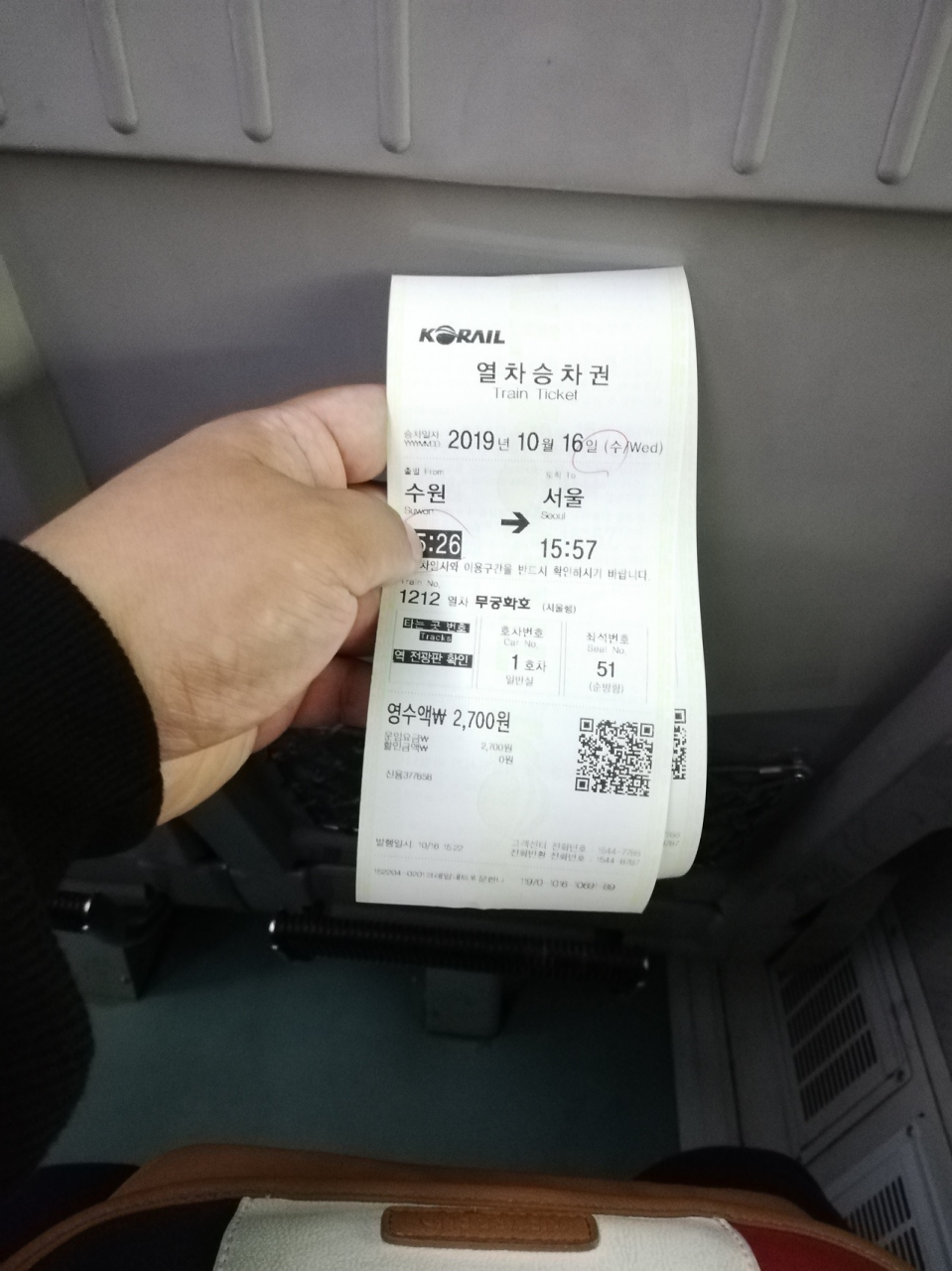 みなさんこんにちは、ふとももぷるぷるです。2019年10月16日に韓国の水原駅からソウル駅までKorailのムグンファ号を利用しました。