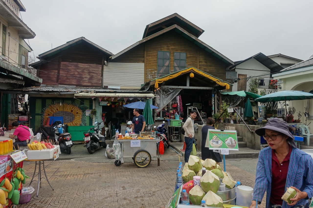 船着場は昔ながらの木造の建物を通った先にあり、建物内ではお土産などが売られています。外でもフルーツや飲み物を売っていたり、近隣には食事ができる店もあって、ワットポーの最寄りということで結構賑わっていました。
