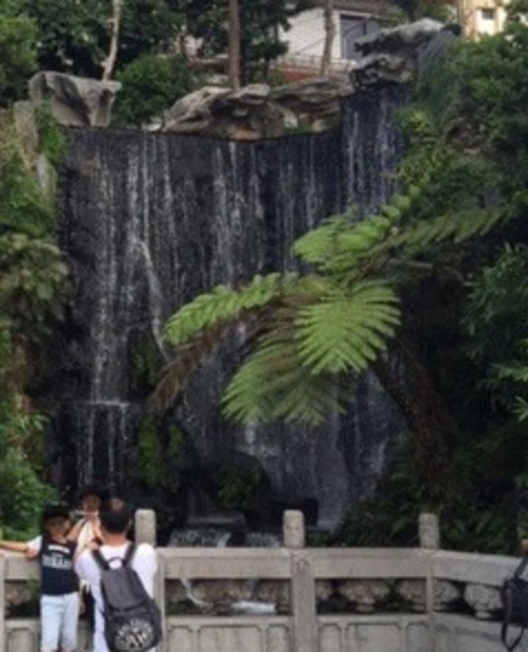 龍山寺の本堂の手前側の右側面にある人口の滝です。日本のように都心部でもホテルの庭などに人口の滝がある身としては特にすごいという感じではないですが、緑も綺麗に配置されていてきっと台北のような雑踏の中で自然っぽくて憩いスポットでもあるのかなと思いました。アジア系の人が代わる代わる写真を撮っていました。