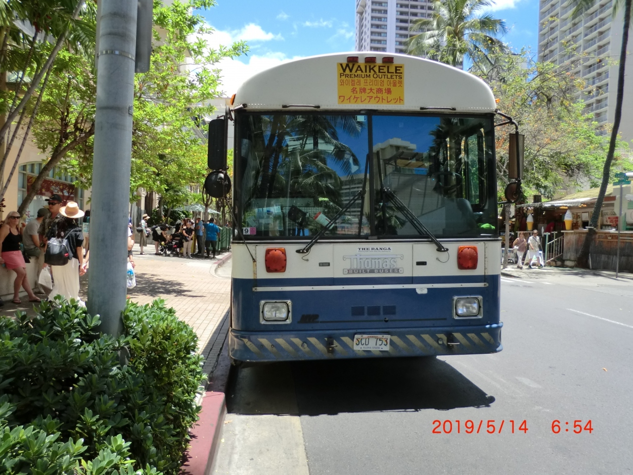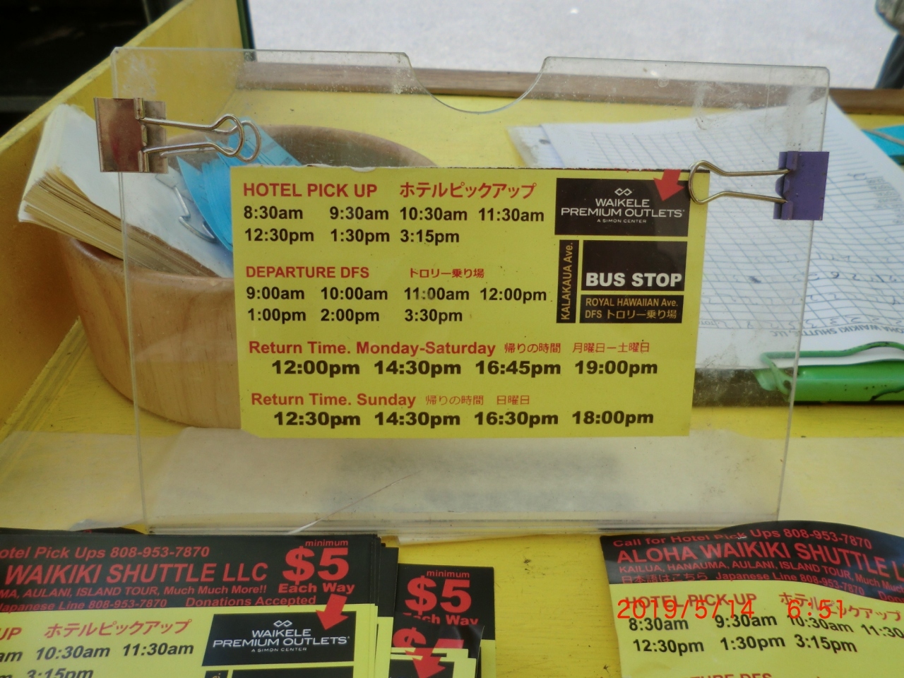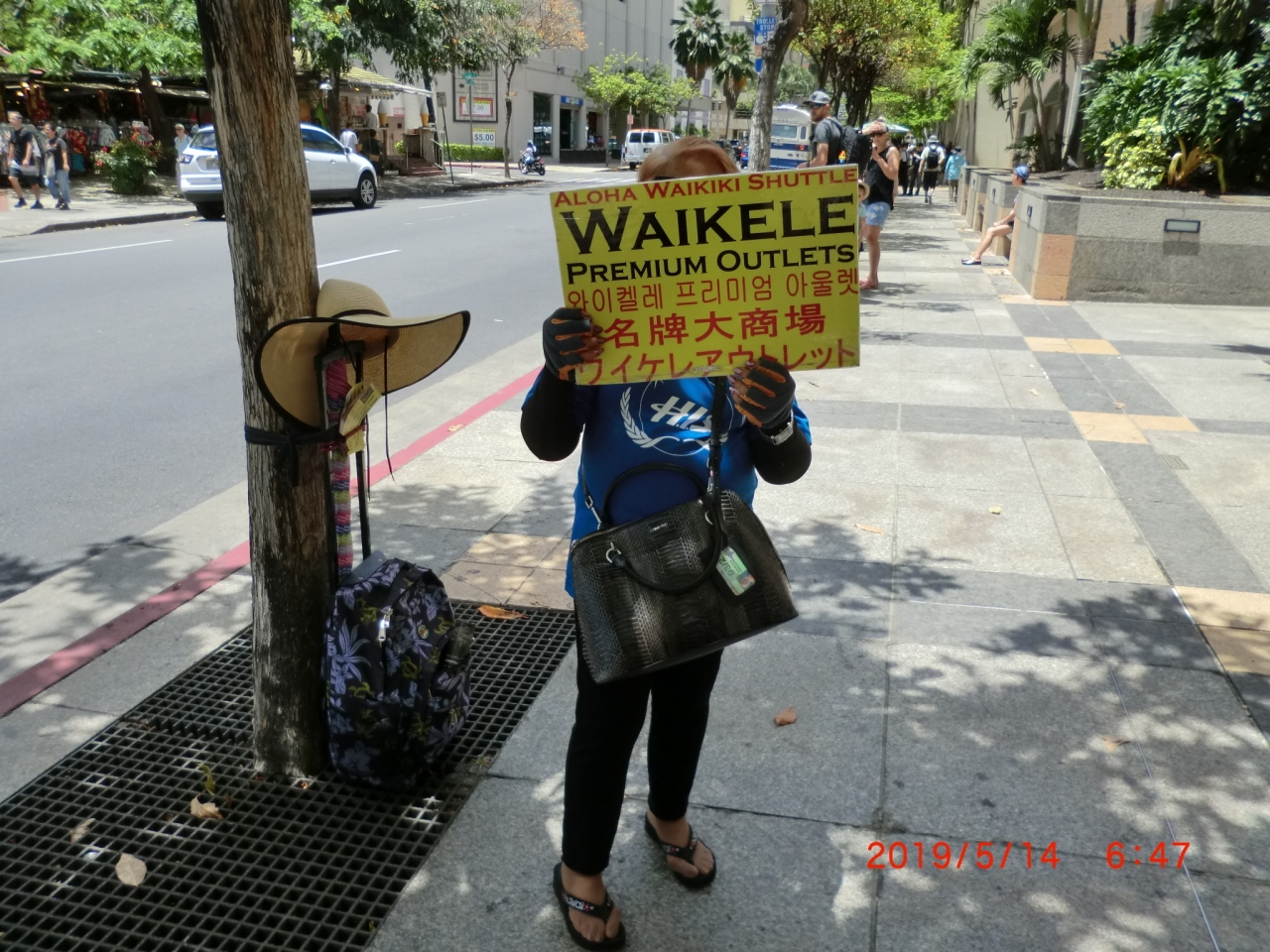 私は毎回アウトレットに着いたその日に行きます。ワイキキから1時間位かかります。安く行く方法はDFSに「ALOHA WAIKIKI SHUTTLE」=往復10ドル。観光会社やホテルからの紹介で20~30ドルのツアーがあります。30%OFF~70%OFFの店があります。ほとんどMADE IN USA です。なんでアウトレットなのか判りませんがしっかりしたものです。ただし、アメリカンサイズなので衣服は試着、サイフなどはドル札のサイズなので注意が必要です。ランチも出来ます、レストランは少し歩きます。ホームセンターも歩きます。9時出発、10時着、買い物3時間、帰路1時間と考えたほうがいいでしょう。ノンビリしてランチならプラス1時間、時間の指定が出来ないので事前調査したほうがいいと思います。レンタカーなら片道45分位です。とにかくお得です。