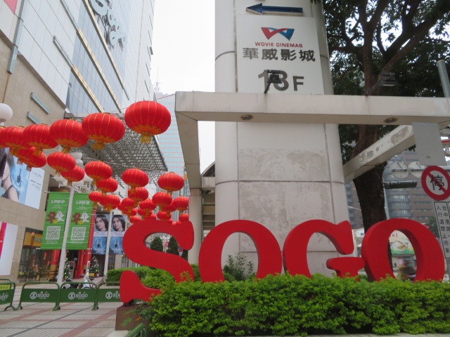 宿泊ホテルのすぐそばにあって行ってみました。歩道に、SOGOという赤い文字が出ていてすぐにわかります。台湾ということで、入り口の柱も赤で、ランタンもたくさん飾ったいて台湾気分を味わえます。内部は普通のSOGOでした。