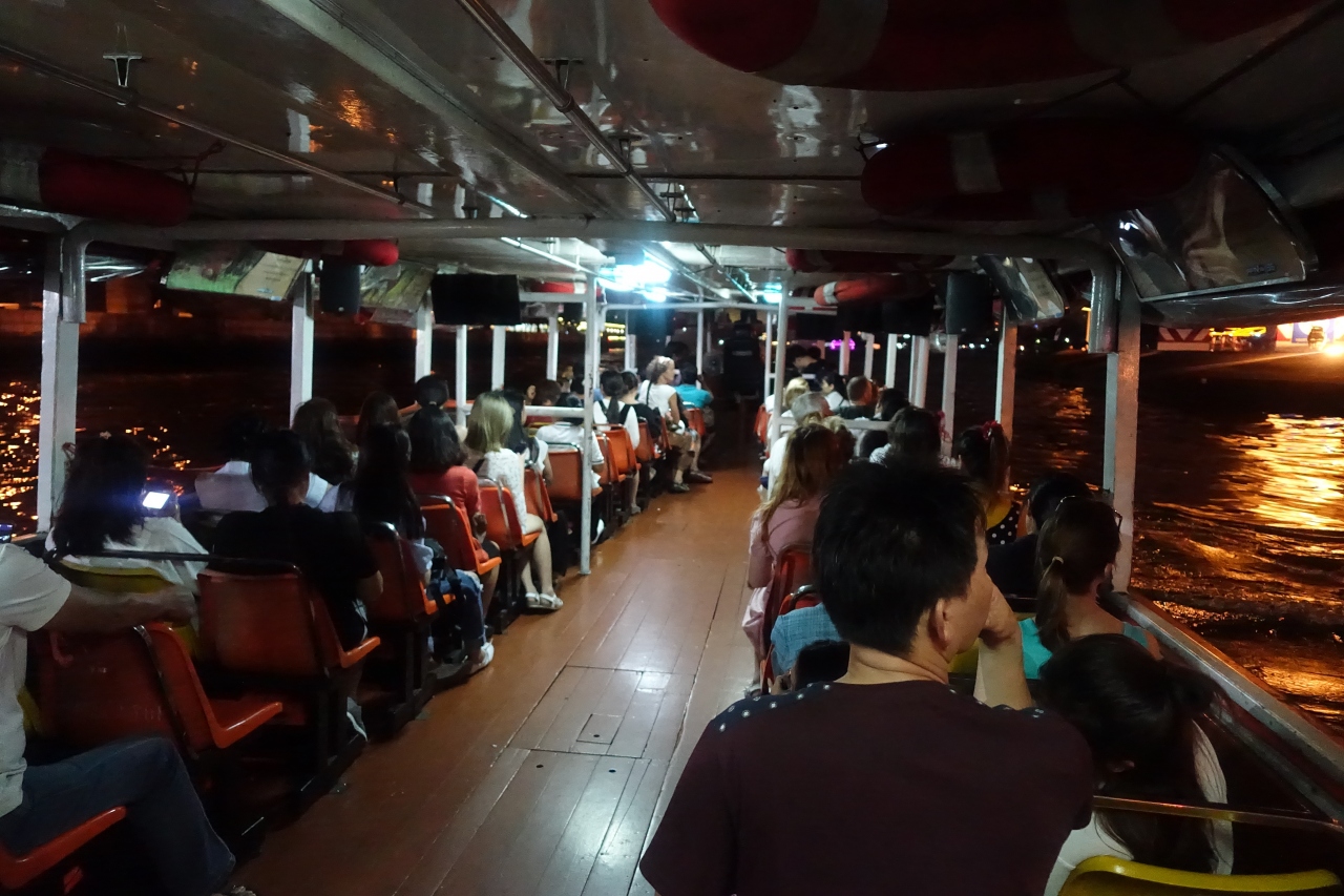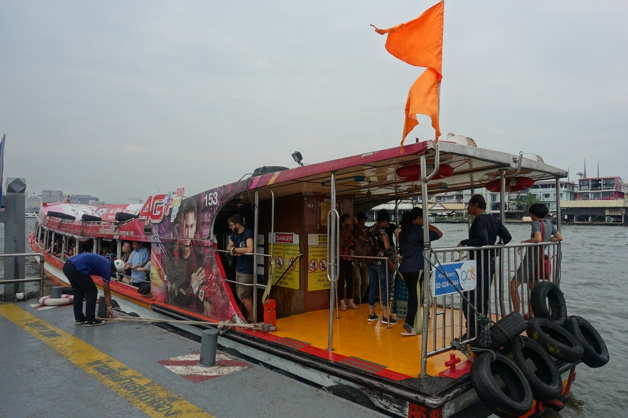 今回の旅行で乗船した区間は ラーチニー→サートーン、別の日に サートーン→ワットアルン の2回(2区間)。オレンジ色の旗の急行は運賃15バーツ。停車案内によるとラーチニーは「各駅停車」しか停まらないはずなんですが、なぜか「急行」がやってきました。理由は不明です。基本混んでいるのが難点ですが、運賃が安いのと渋滞が無いのが利点。それと単なる移動手段ではなく、お手軽にリバークルーズ気分を味わうこともできてしまいます。