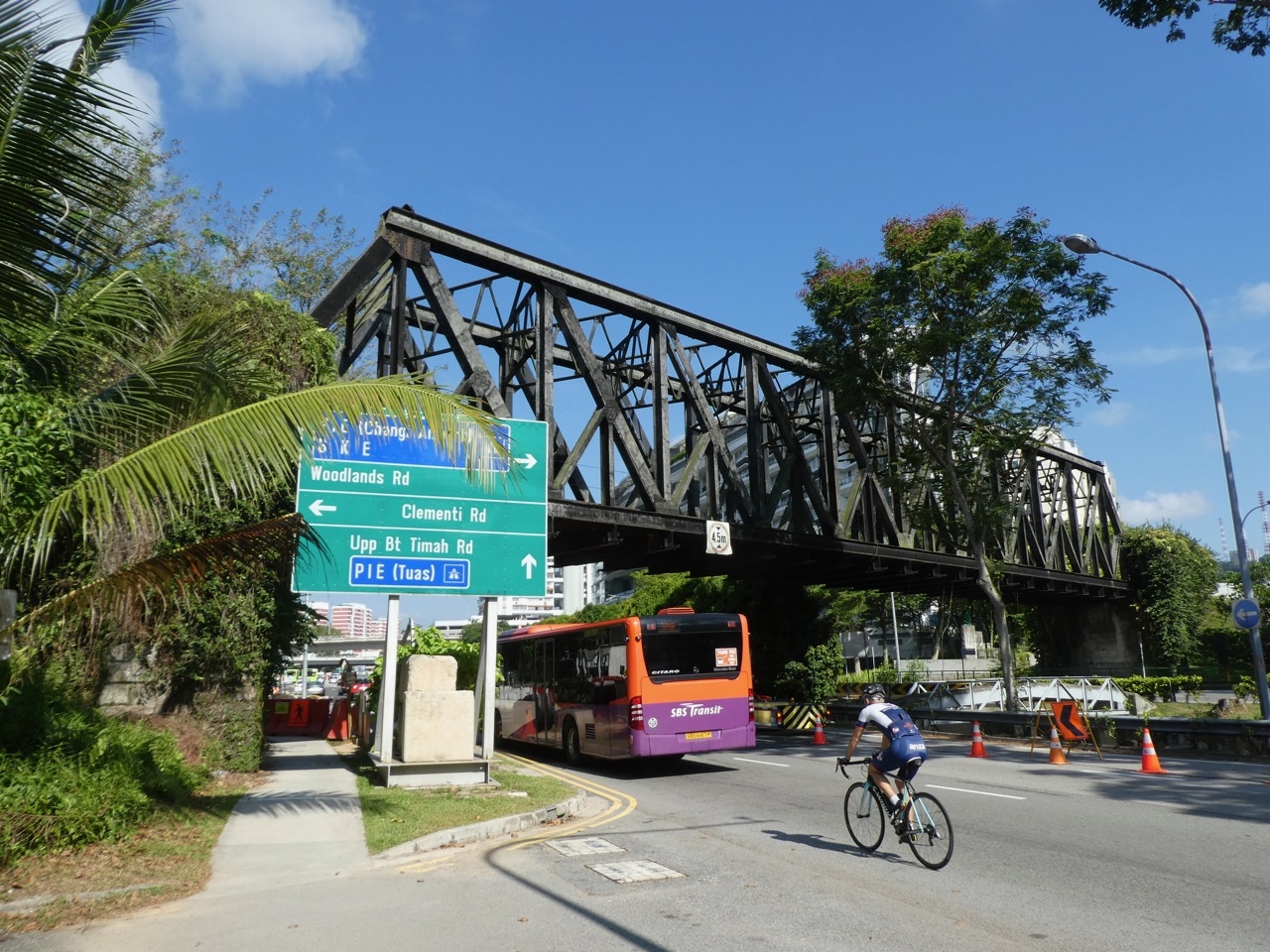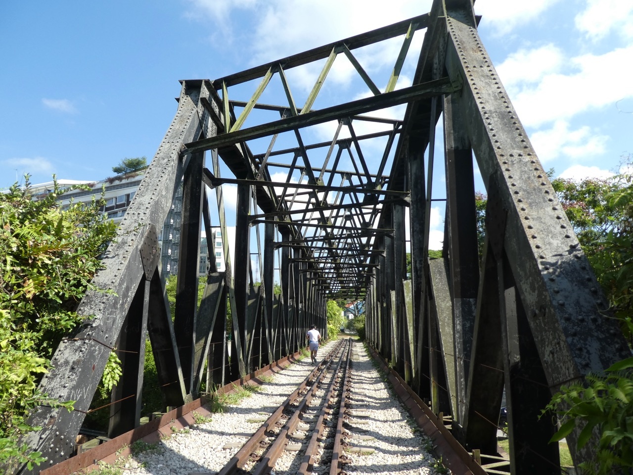 一部の区間はグリーン・ウェイとして散歩道になっています。ダウンタウン線のキングアルバート・パーク駅から3分ほど西方に鉄橋があります。土手を登ると線路が残っていて、普通に渡れました。上記散歩道で、ジョギングしている人も多くいました。鉄橋のちょっと都心寄りにはブキティマ信号所の建物が金網に覆われて残っていました。