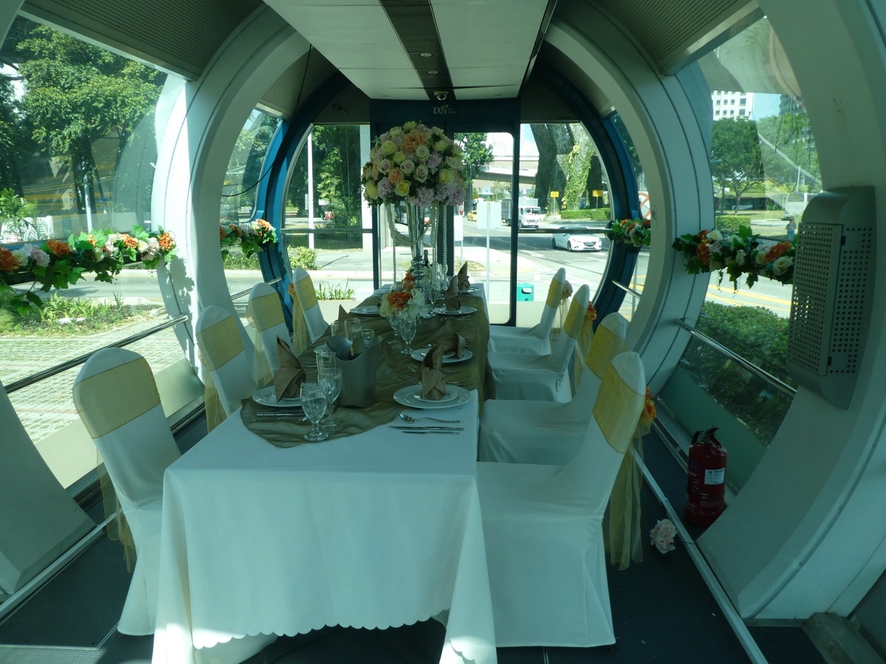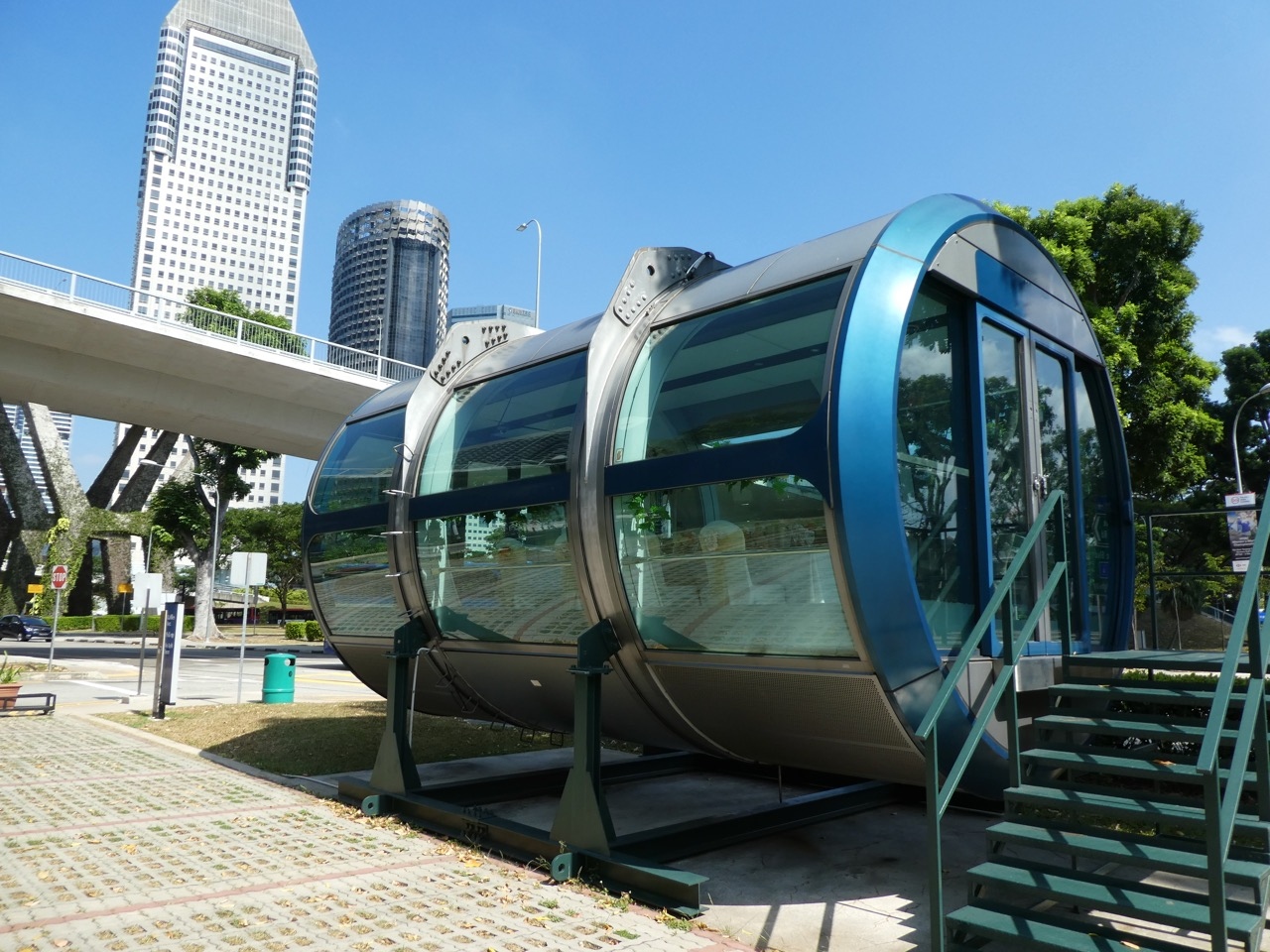 プロムナード駅のAの出口からラッフルズ・ブールバード(ラッフルズ大通り)を東へ歩いて2分。高速道路をくぐってすぐのシンガポール・フライヤーの駐車場の北側のちょっとした広場に、シンガポール・フライヤーの箱が置いてあります。ディナーのセッティングをした状態で。たぶん、モックアップをそのまま展示しているのだと思います。中に入れないですが階段があって窓ガラスに顔をこすりつけて中をのぞいたり、箱に触ることはできます。記念撮影もできちゃいます。「ディナーした」ように見えるか、はわかりませんが、面白い写真は撮れると思います。