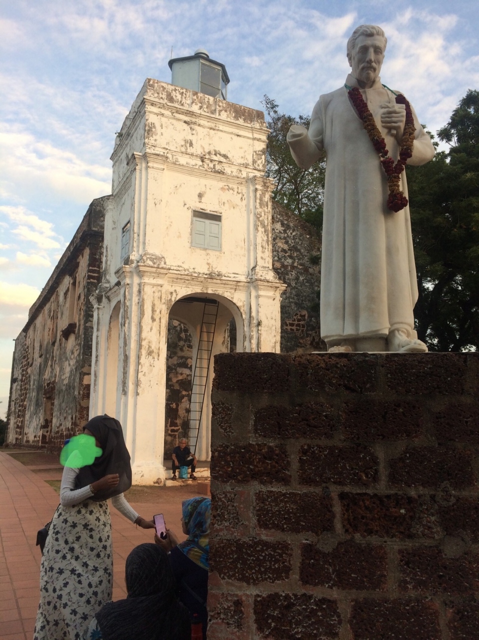 オランダ広場から徒歩で少し丘をあがっていくと、この教会に到着します。古い、古い建物でもう、建物をなしていなく壁が残っていて天井もありませんでした。白いザビエル像が教会の前に建っています。壁の前で写真を撮ると映えました。