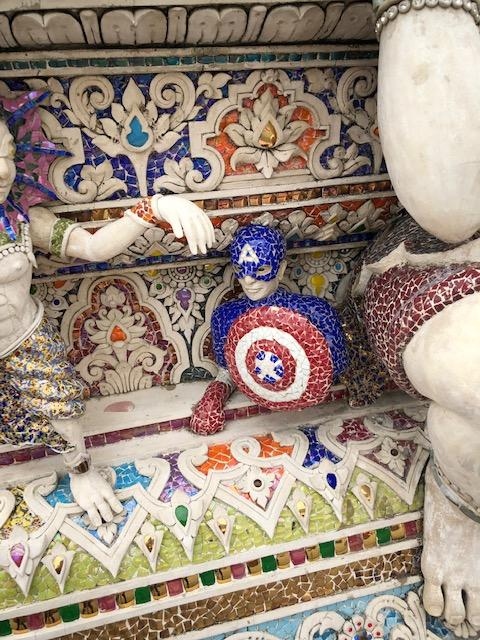 BTSシーロム線のチョンノンシーでBRTに乗り換えます。BRTは専用レーンを走るバスで交通停滞とは無関係。BRTチョンノンシー駅から6つ目の駅ワット パリワットでバスを降ります。階段を降りるとすぐに寺に通じるソイがあります。このお寺の本堂はとても面白いですよ。是非に行ってください。ミッキー、ポパイ、スーパーマンたくさんいますよ
