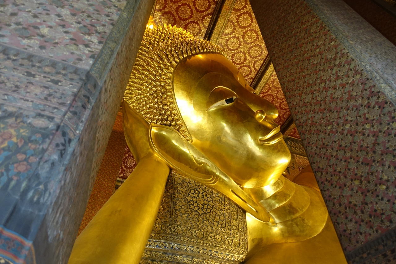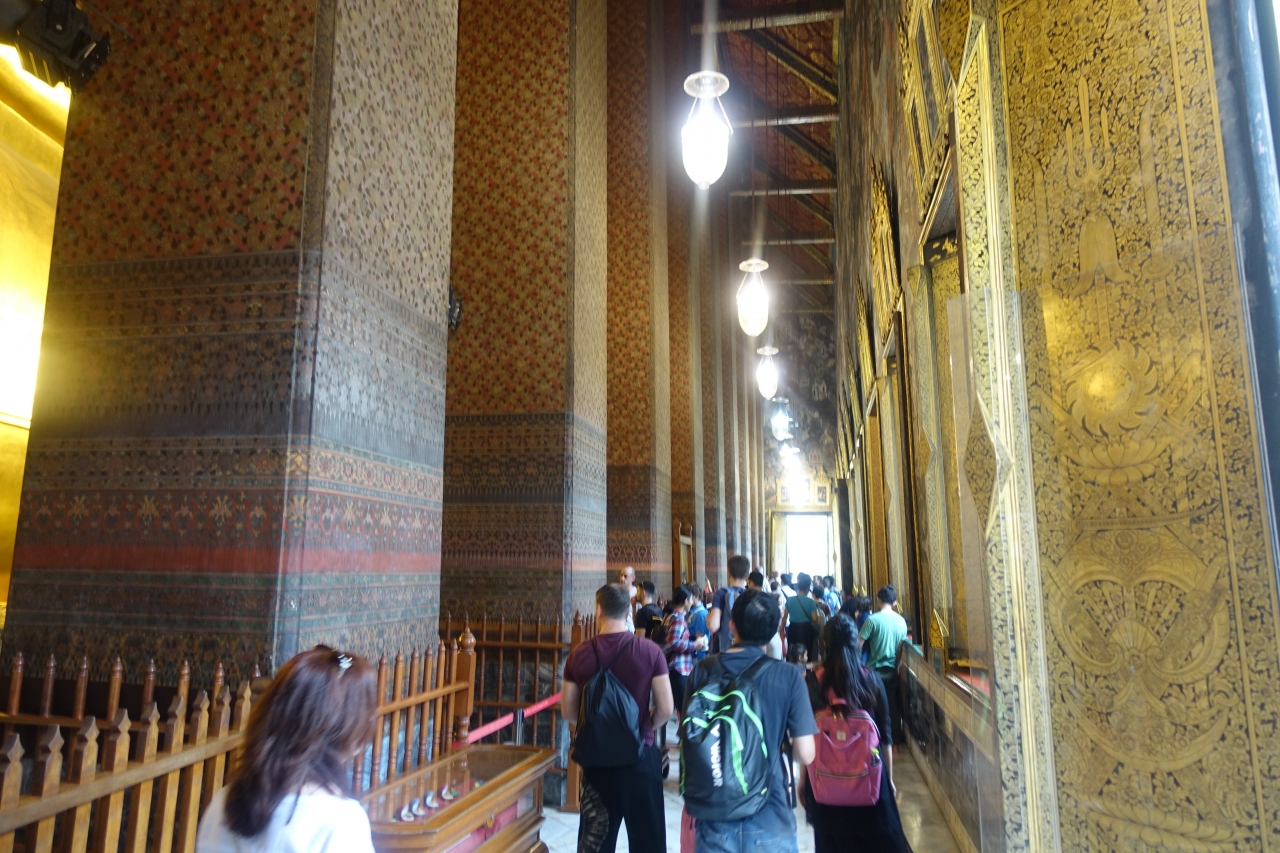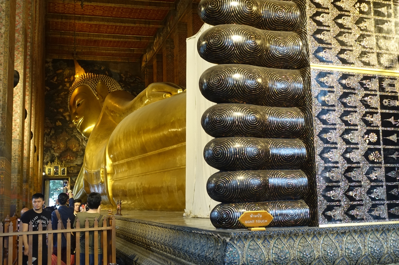 涅槃仏は金色に輝き巨大で圧倒されます。足の一部分のみシートがかけられ修復中でしたが、全体の外観にはそれほど影響なしでした。手前に柱が何本もあってやや邪魔なので、写真に収めるにはいくつか決まったポイントから撮る必要があります。人が重なると写真撮影の順番待ちになることも。涅槃仏は裏側(背後)からも見ることができます。