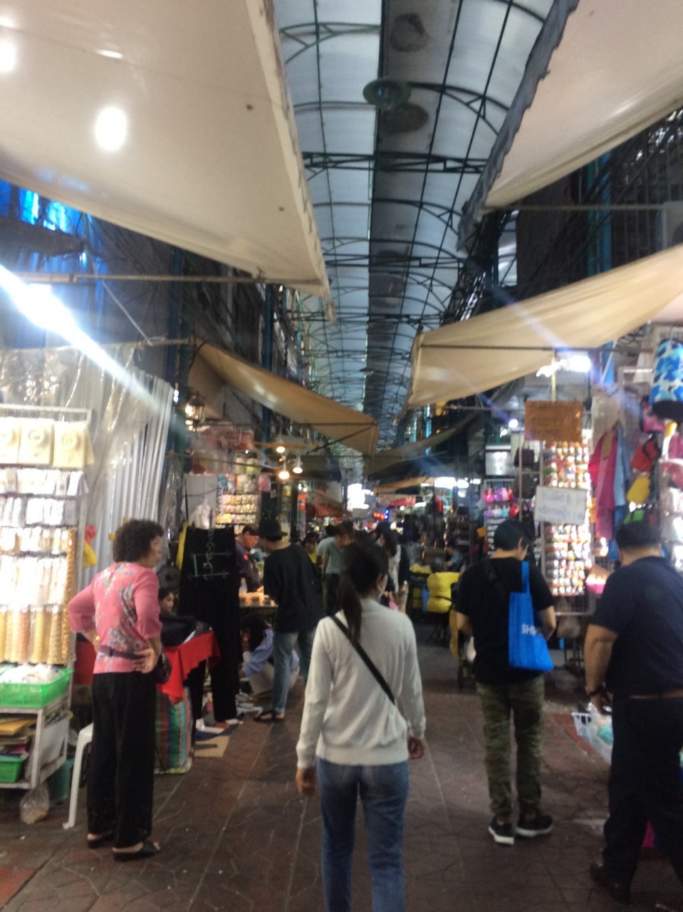 チャオプラヤ川から船で渡し船場におりて、少し歩くとこの市場というか問屋街に到着しました。ありとあらゆる雑多なものが売られていました。人込みもすごいので、スリに気を付けてください。こんなに細い路地でもバイクや台車が通り、にぎやかでした。