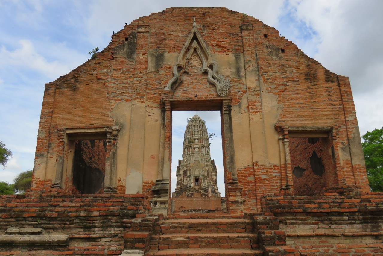 ワット マハータートの隣にある遺跡群。入場料は50バーツ。礼拝堂跡と大きなクメール様式の大仏塔が見どころ。近づいて見ると細かな彫刻も見事で神秘的。礼拝堂跡から覗くように見えた大仏塔はとても存在感がありました。