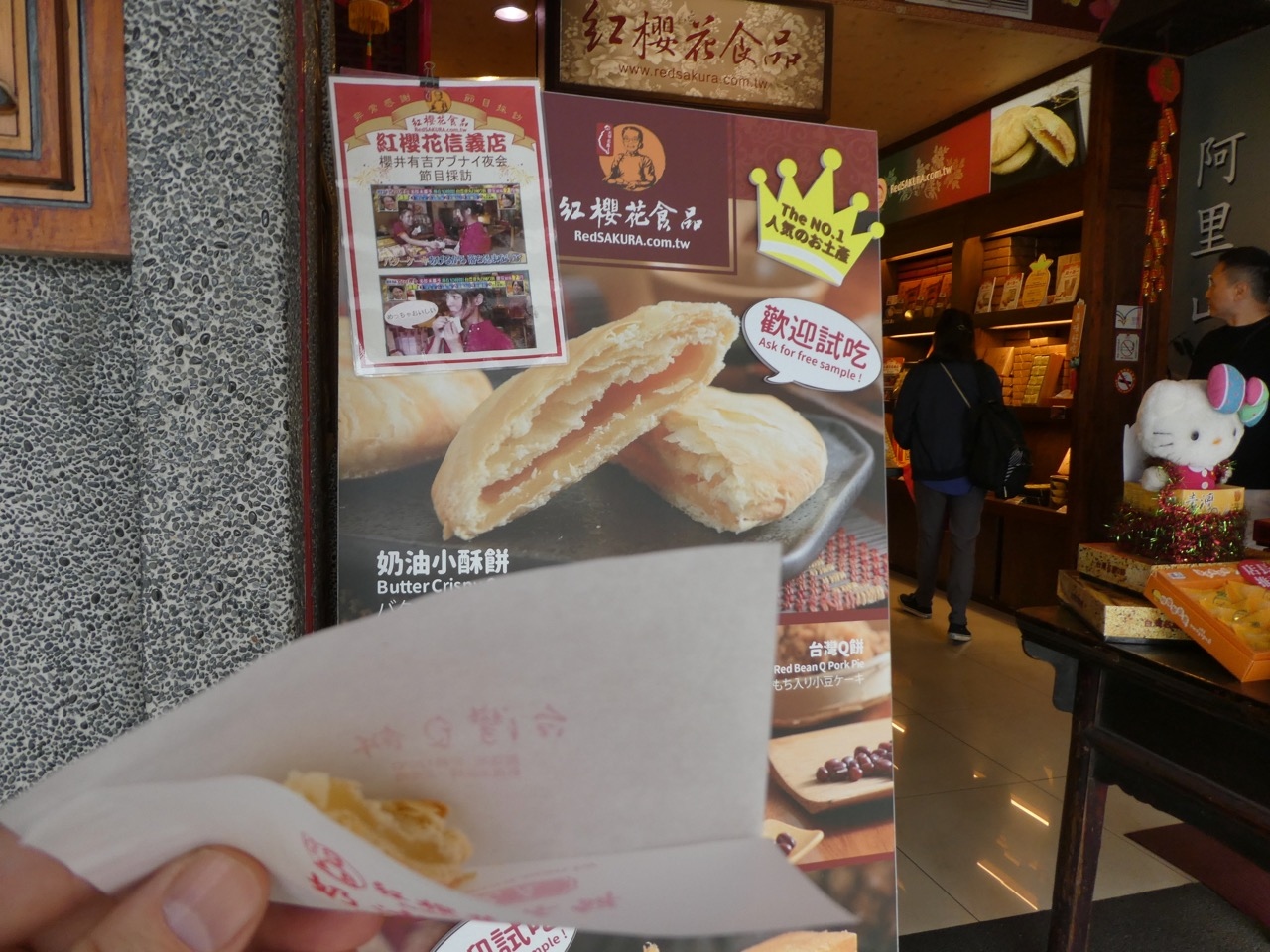 東門駅から大通りを鼎泰豊方面に歩いていたら試食どうぞ、とつかまり、パイを試食。キティちゃんが店頭にあるあたり、観光客目当てのお土産物屋さんでしょう。試食のパイそのものはさくさくですが、底がやや詰んだ感じ。油分使いすぎるとこうなるなあ、と。リッチではあるのですが。おいしかったですが、とくに台湾ならでは、かというと違うようですので今回は見送りました。