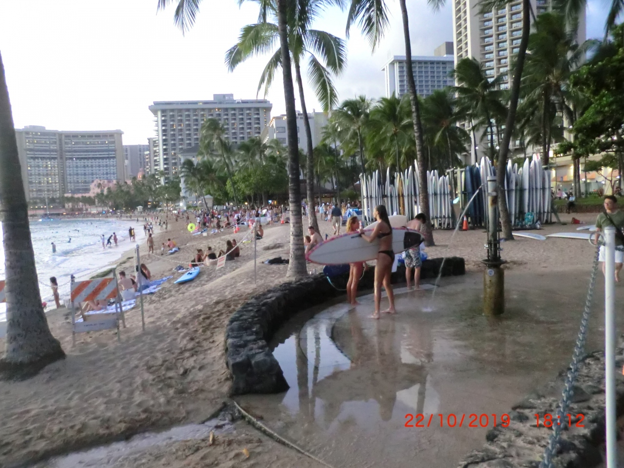 海と通りの間には水シャワーがあり体や足を洗えます、トイレも近いです。お子様連れにはお勧めです。ここからは海に沈む夕日が見れます。また曜日によって、時間によってフラショーも見れます。開始は夕没後になります。