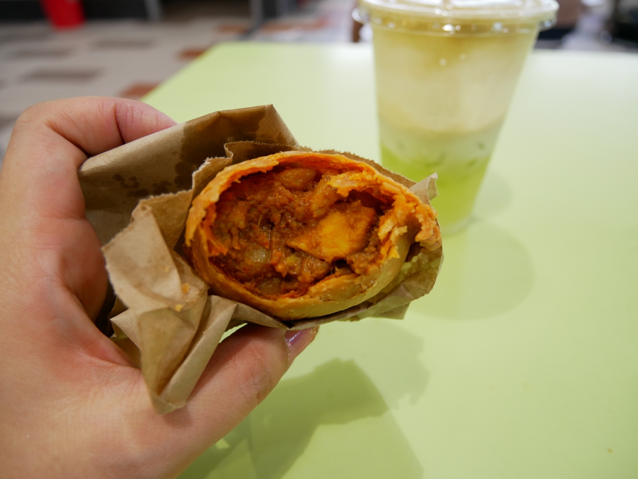 皮はサクサクで軽く、フィリングは本格的な辛いカレーとチキン、ポテト、茹で卵でボリュームたっぷり。美味しかった!
