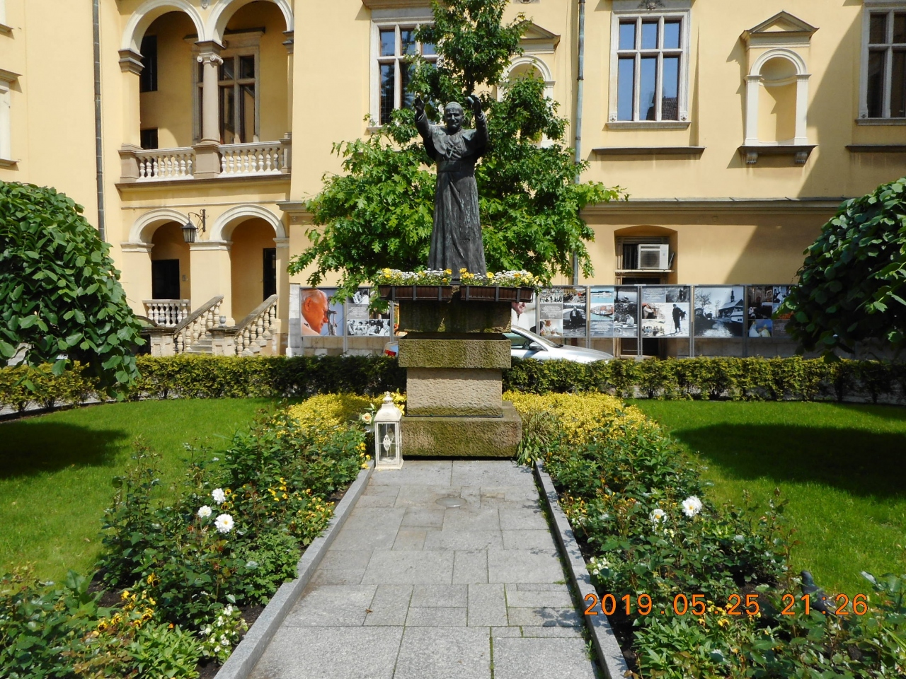 フレデリック・ショパン記念碑のある大学公園から東に数分のところに教皇の窓と呼ばれている、建物2階の窓にローマ教皇の絵が飾られている場所があります。その建物の北側に中庭があり、そこにヨハネパウロ2世像が建っています。中庭を囲んでいる建物が大司教宮殿だと思います。