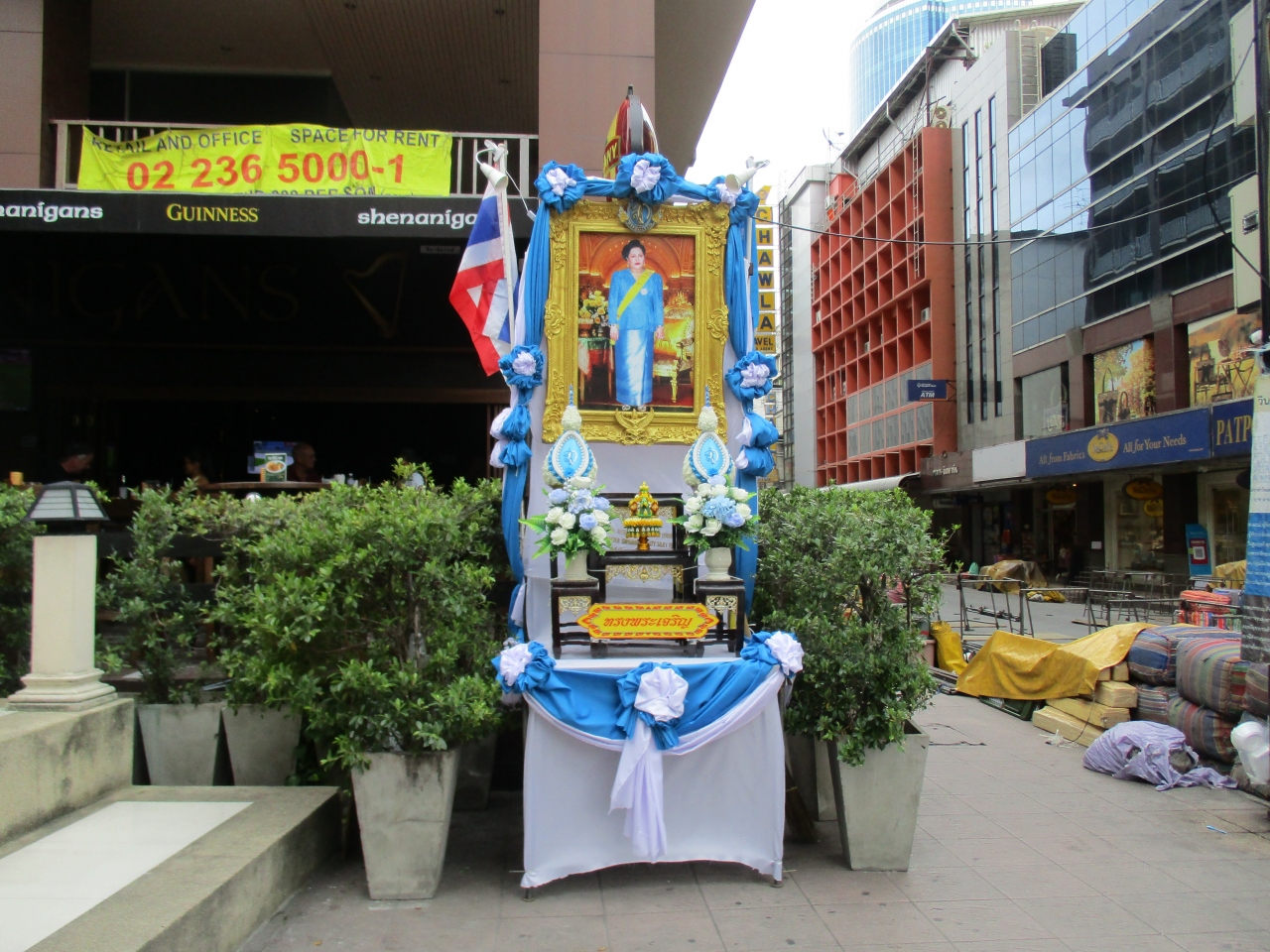 8月12日はクイーンシリキット王妃生誕記念日で、タイにおける「母の日」でもあります。母の日が近づくとバンコクの街中で王妃様の写真が飾られます。パッポン通りには写真が飾られていました。大きい写真にドンと入口に置かれていたのが珍しかったです。皇室関係の誕生日であっても通常営業ですので、夜の屋台の営業に向けて通りの準備が進んでいました。