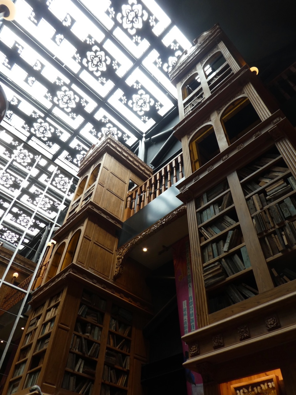 建物が見ものです。2階部分から上は無くなったレンガの壁だけ。その上にガラス屋根をかぶせた奇妙なビルです。その中もすごいです。天井までの本棚。とどかない、なんて野暮は言わない。すばらしい景観です。