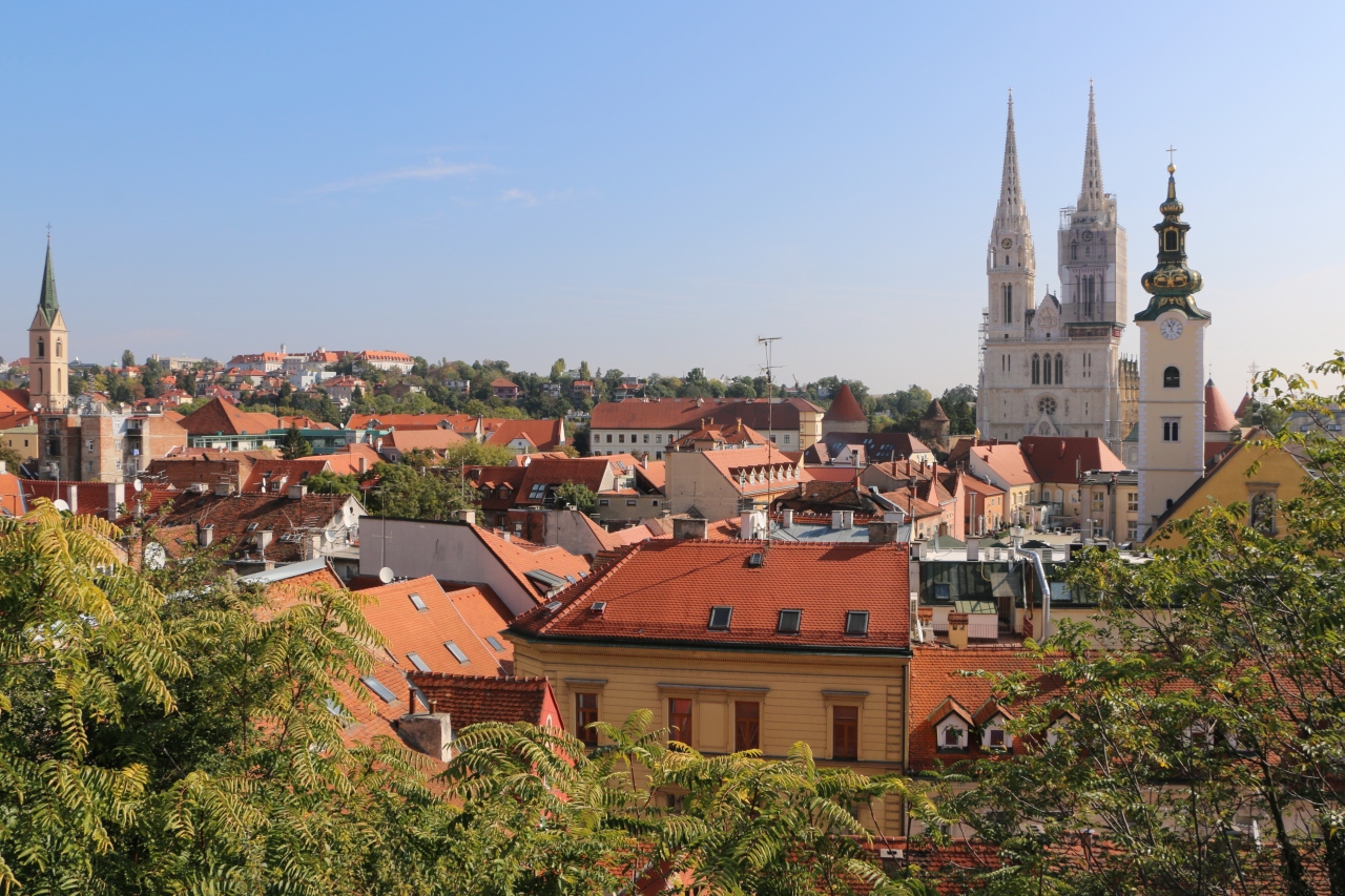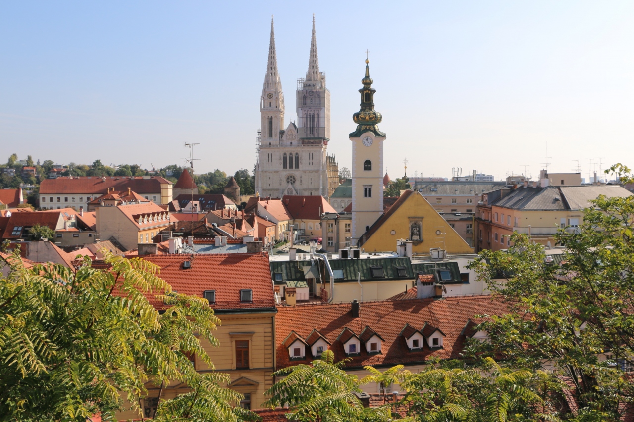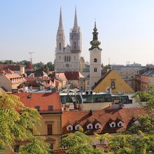 オレンジ色の屋根が連なる美しい家並み、大聖堂や聖マリア教会、左手には聖フランシス教会の塔も見えます。