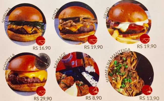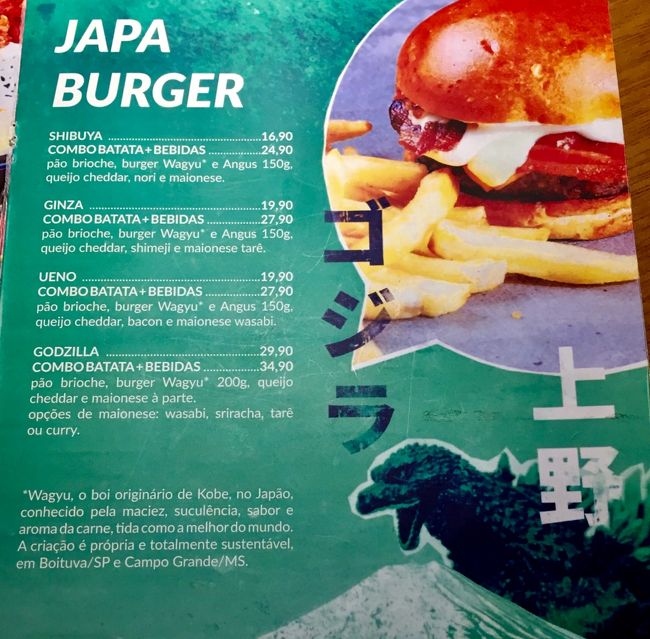 雰囲気は怪しいけど、さりげに本物の「和牛バーガー」有り。その名も「JAPA BURGER」。渋谷(Shibuya)バーガー/銀座(Ginza)/上野(Ueno)/ゴジラ(Godzila)各種。美味いぞ!これぇ~!